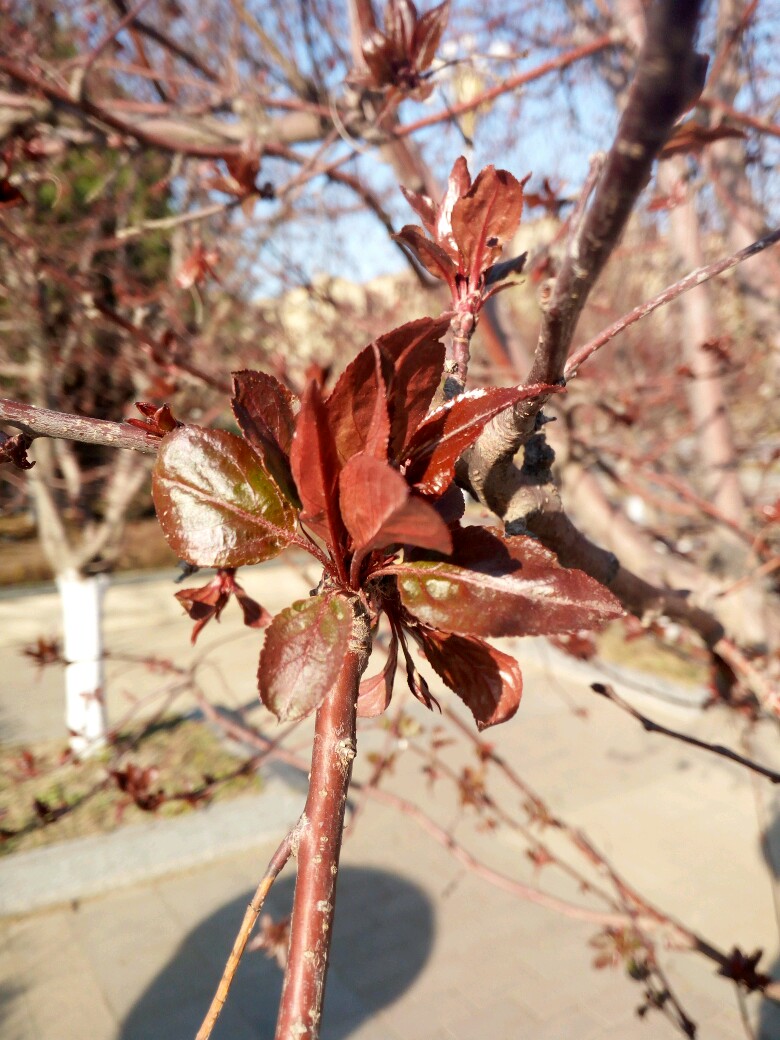 北美海棠紫色的叶丛中藏着花苞
