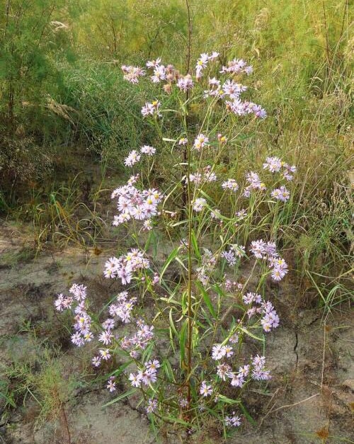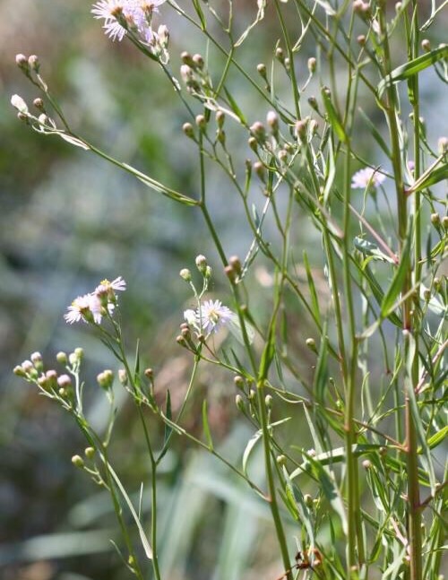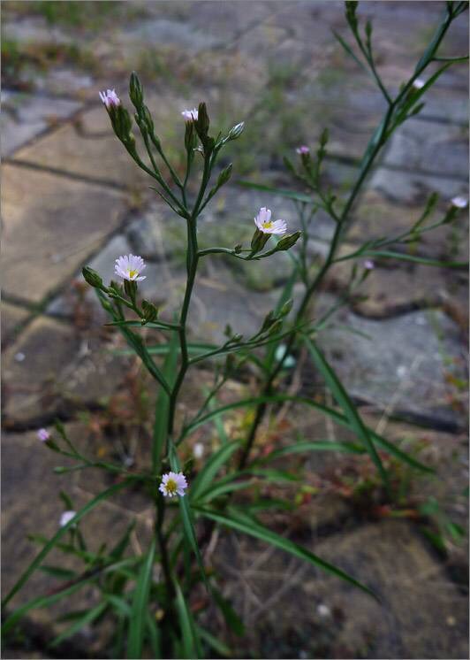钻叶紫菀多年生草本,高25-80cm。茎基部略带红色,上部有分枝。形态特征:叶互生,无柄;基部叶倒披针形,花期凋落;中部叶线状披针形,长6-10cm,宽0.5-1cm,先端尖或钝,全缘,上部叶渐狭线形。头状花序顶生,排成圆锥花序;总苞钟状;总苞片3-4层,外层较短,内层较长,线状钻形,无毛,背面绿色,先端略带红色;舌状花细狭、小,红色;管状花多数,短于冠毛。瘦果略有毛。
