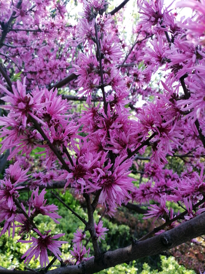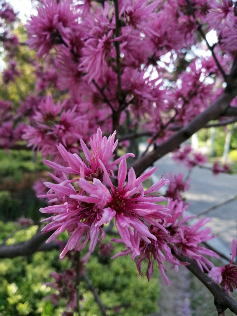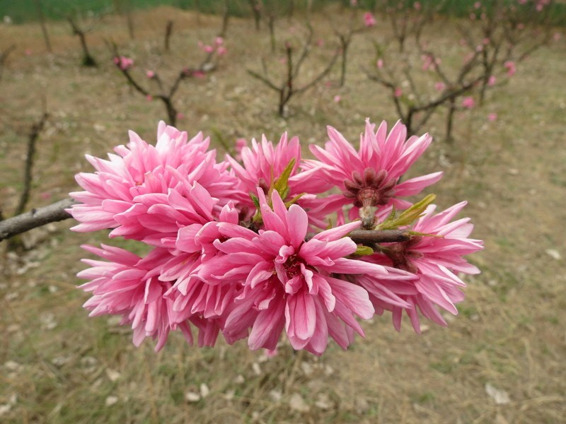 菊花桃,因花型酷似菊花而得名,是观赏桃花中的珍贵品种。为蔷薇科李属落叶灌木或小乔木,树干灰褐色,小枝灰褐至红褐色,叶椭圆状披针形,花生于叶腋,粉红色或红色,重瓣,花瓣较细,盛开时犹如菊花,非常漂亮。