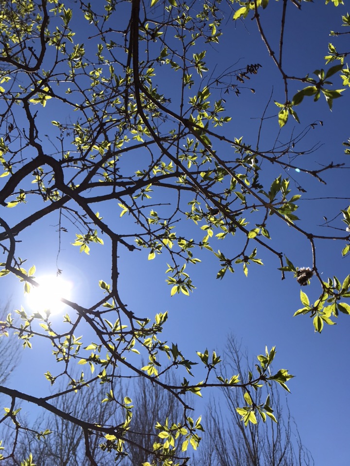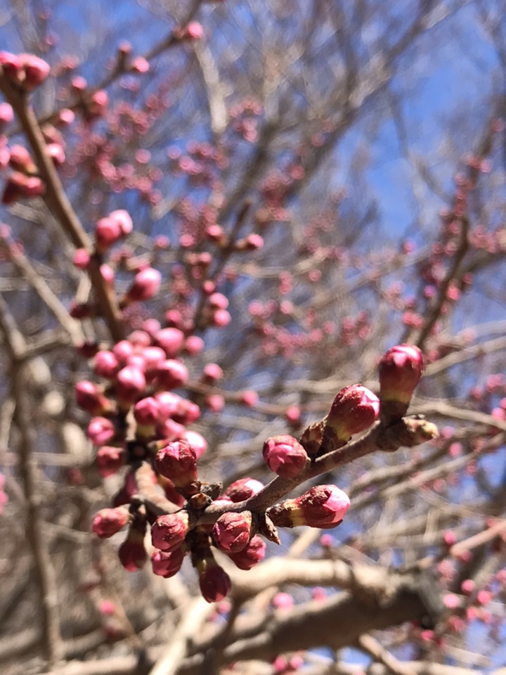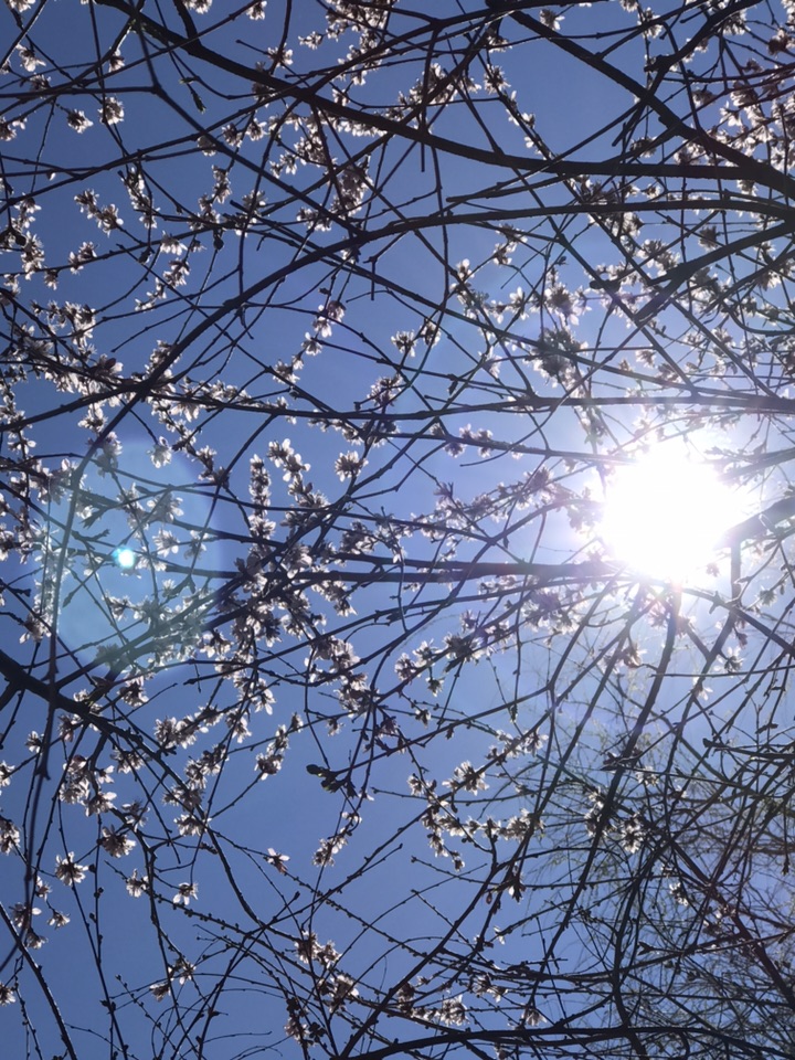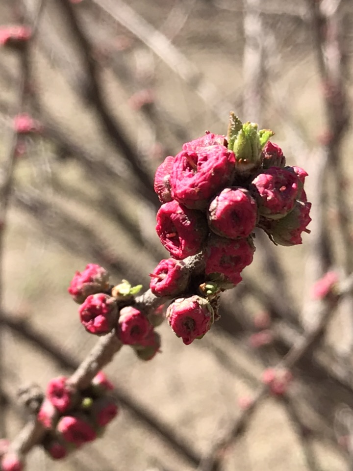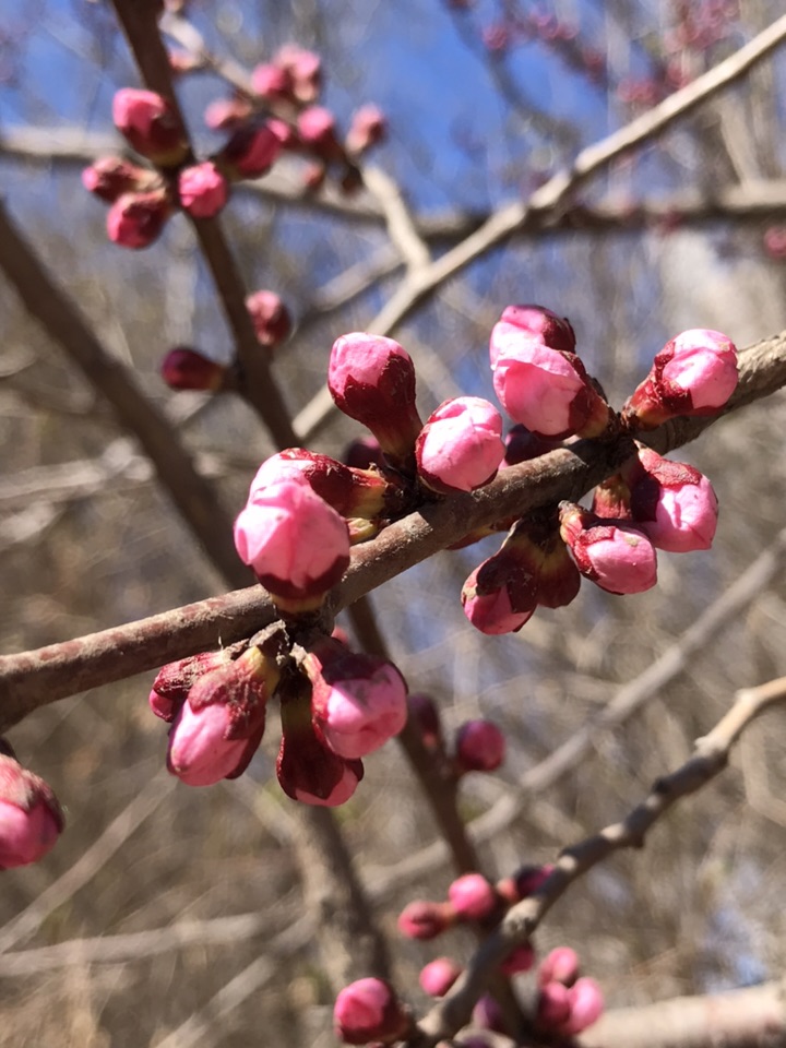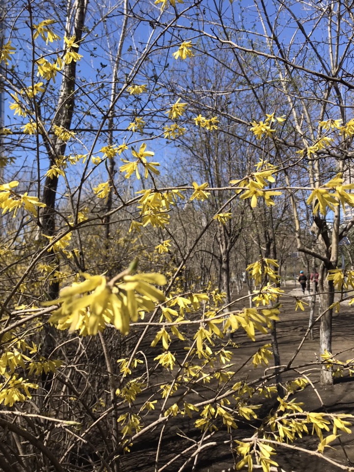早上刚刚下过一场春雪,转眼又晴空万里。正午阳光明媚灿烂,蓓蕾初绽花朵明艳
