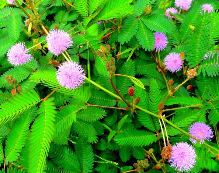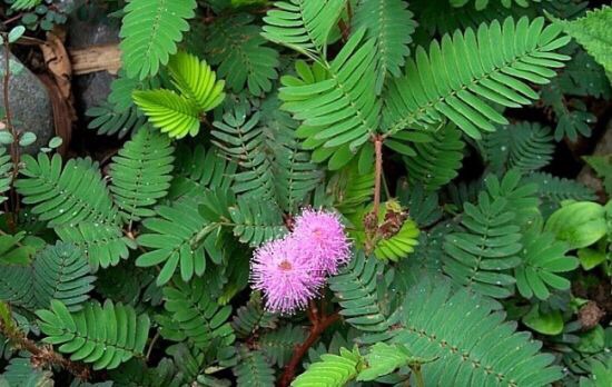 含羞草(学名:Mimosa pudica Linn. ):为豆科多年生草本或亚灌木,由于叶子会对热和光产生反应,受到外力触碰会立即闭合,所以得名含羞草。形状似绒球。开花后结荚果,果实呈扁圆形。叶为羽毛状复叶互生,呈掌状排列。大约在盛夏以后开花,头状花序长圆形,2-3个生于叶腋。花为白色、粉红色。