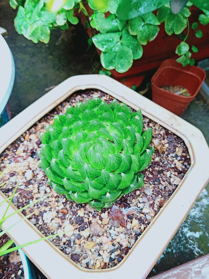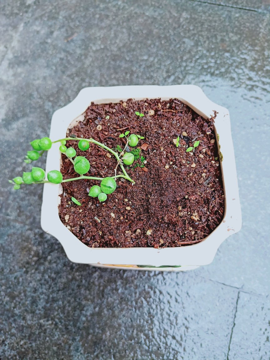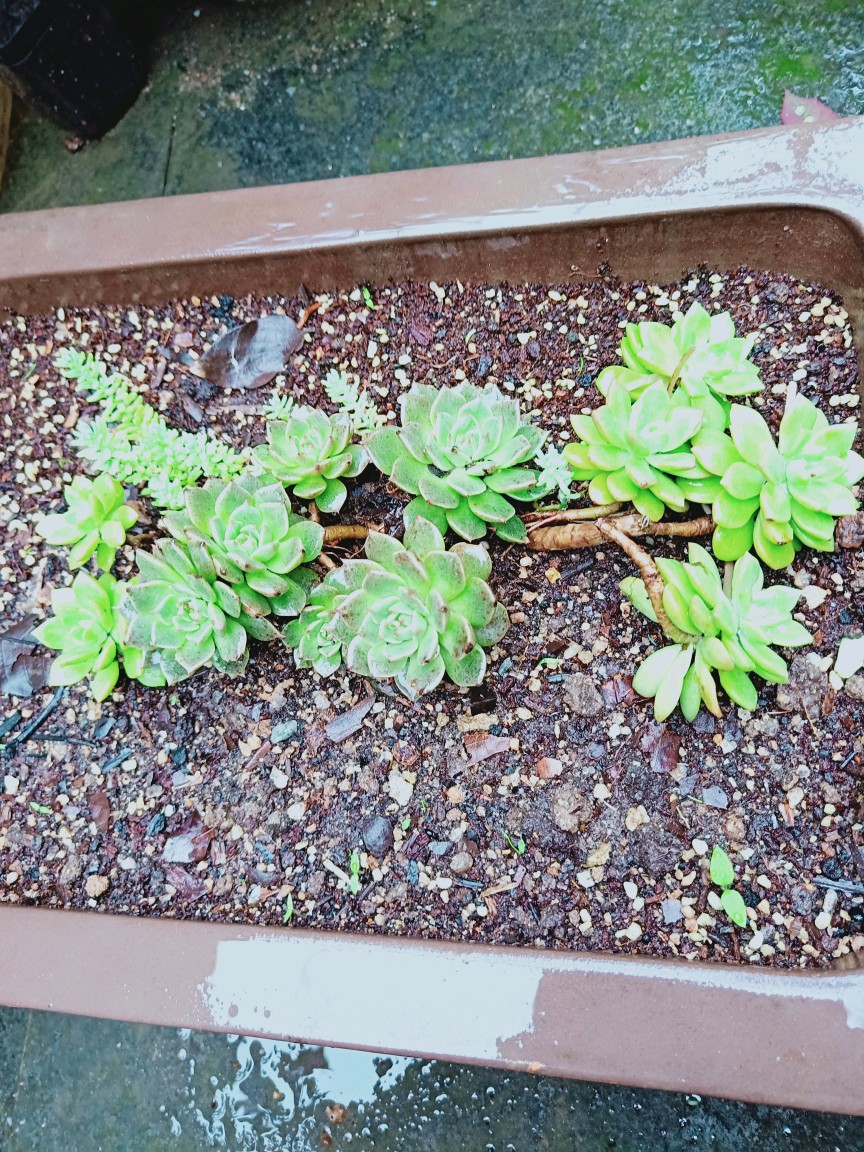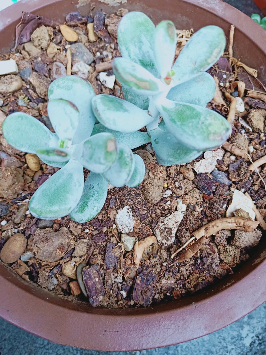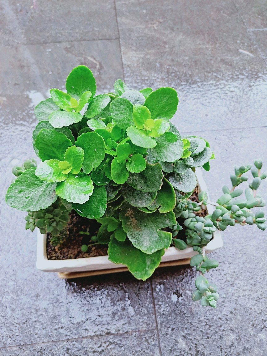 又一盆拼盆,中间大的是长寿花,养了一段时间了,还有鹿角海棠,刚中的时候只有一小段,最左边的不知名,长寿花下还有一小株情人泪💦