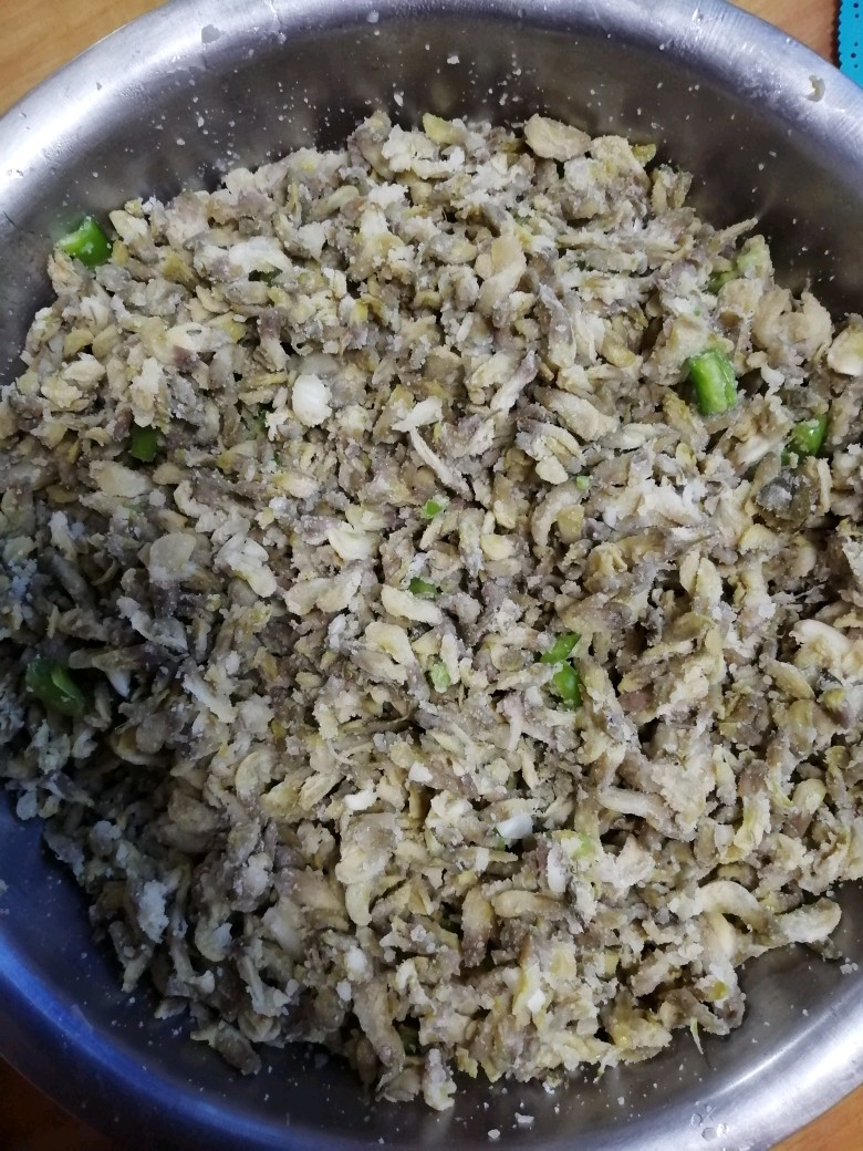 步骤4蒸好了,把捣好的蒜泥,放上盐,青椒,香油,能吃辣的,可以再放一些辣椒油,拌入。味道好极了。