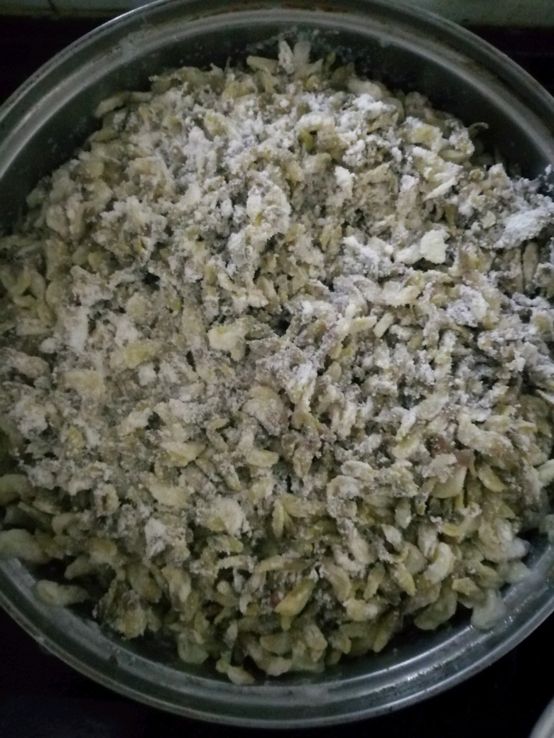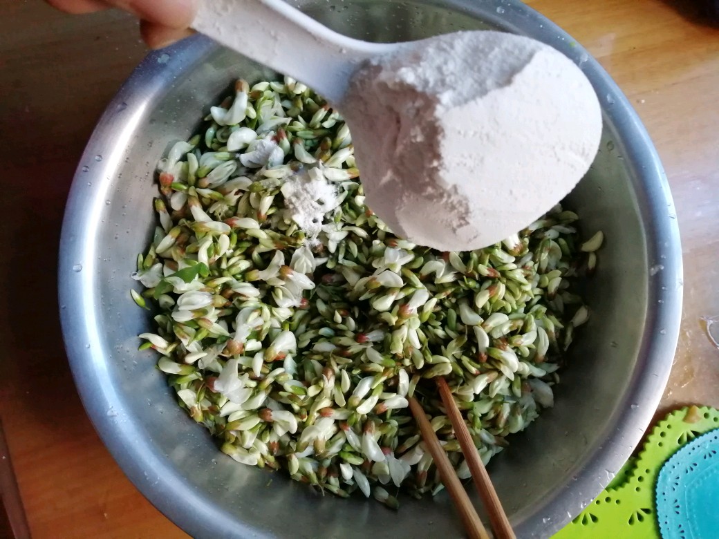 步骤1槐花清洗干净,放在通风处晾干。拌上少许食用油。这样槐花在蒸的过程中不会出水分,保留槐花香气。