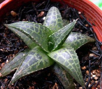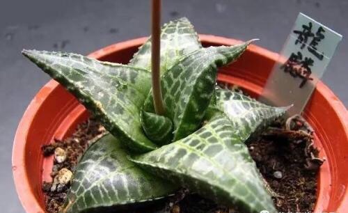 龙鳞(学名:Haworthiopsistessellata (Haw.) G.D.Rowley)又名蛇皮掌,是阿福花科十二卷属的多年生植物。中文名来源于其日文名“竜鳞”,因叶面纹路酷似龙的鳞片或蛇皮而得名。