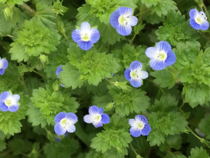 阿拉伯婆婆纳,玄参科,婆婆纳属,铺散多分枝草本植物,原产于西亚。这个名字土洋结合,很奇妙。有一种说法,说它的果实顶端凹如针眼,果实两面有一条沟槽像是穿线留下的痕迹,和老婆婆做针线活的工具相似,因而得名阿拉伯婆婆纳。我愿意相信这个说法,它使我想起老外婆以前四季不停地为晚辈纳鞋底、穿针引线的慈祥身影。