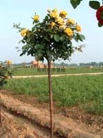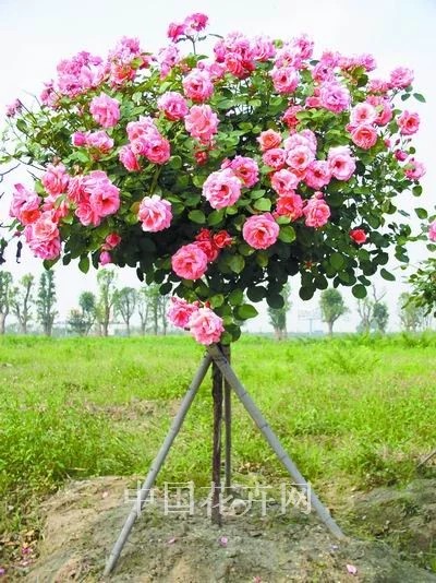 树状月季并不是特殊的月季品种,而是特殊的栽培方式:将月季高接在寿命长,直立性强的砧木上。作为树冠的月季可以选择“绯扇”、“粉扇”等品种,也可以选用地被月季,枝条下垂,有“亭亭如盖”的效果。砧木常用从山上挖取的野生木香,但大量采挖野生木香对植物资源保护不利,故现在也采用人工栽培的蔷薇类植物作为砧木。