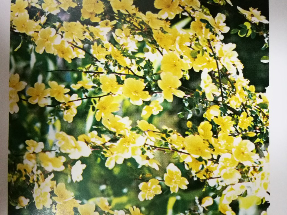黄刺玫是落叶丛生灌木,茎褐色,多刺。小叶7-13,卵圆形,先端钝或微凹。花单生,黄色,有重瓣变种,只在晚春开花一次。