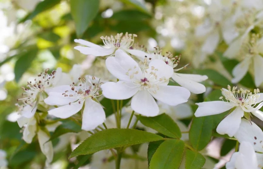 多花蔷薇是落叶灌木,茎拱形下垂或攀缘他物。小叶5-9,托叶篦齿状。花小,白色单瓣,形成密集的圆锥花序。仅在晚春开一次花。其变种有白色重瓣的“白玉棠”、粉色单瓣的“粉团蔷薇”和粉色重瓣的“七姊妹”等。