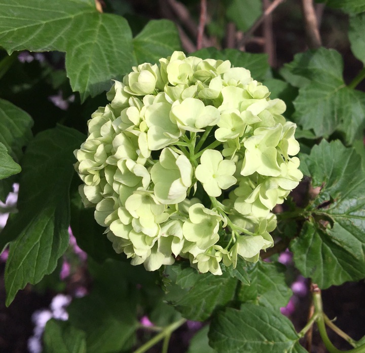 周日在北京植物园还看到一种花,五瓣的绿色小花簇成球状,很像绣球,也像球兰,但从花瓣形状上看应该跟绣球或者琼花接近,查形色,得知它是绣球荚蒾。