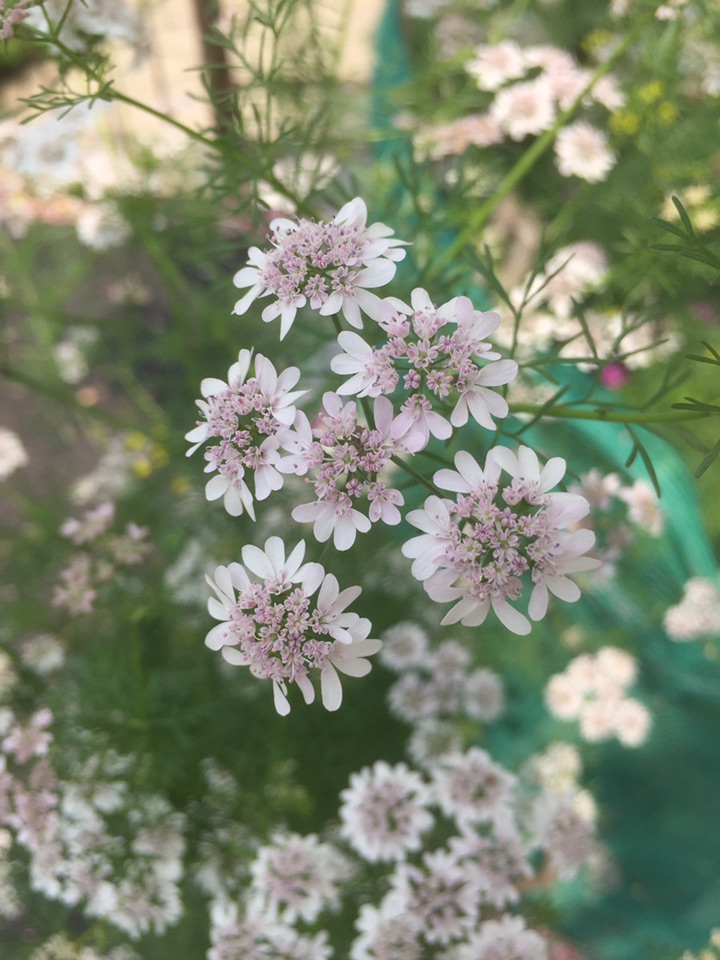 小区里的香菜开了花,远远望去连成了一小片,走近数一数只有几株而已,每一根主茎都裂变、裂变,伸出的新茎上都顶着花,争相竞放。香菜的花,聚拢在一起,像一把把小伞,伞尖由许多淡紫色的小花装饰,每一朵小花都由五组翻转花瓣组成。伞最边缘的一圈,小花的外延花瓣不停的长大,长大,像羽毛一样在风中起舞。