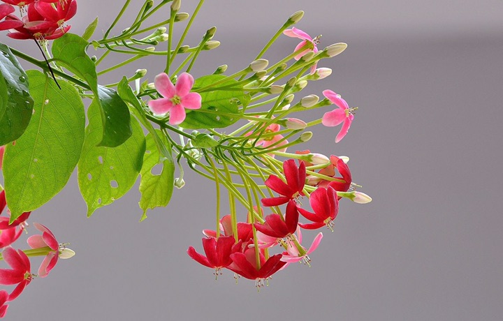 使君子,别名:舀求子、史君子、四君子,(学名:Quisqualis indica Linn.)是使君子科、使君子属攀援状灌木,高2-8米;小枝被棕黄色短柔毛。叶对生或近对生,叶片膜质,卵形或椭圆形,先端短渐尖,基部钝圆,表面无毛,背面有时疏被棕色柔毛,幼时密生锈色柔毛。顶生穗状花序,组成伞房花序式;苞片卵形至线状披针形,被毛;具明显的锐棱角5条,成熟时外果皮脆薄,呈青黑色或栗色;白色,圆柱状纺锤形。花期初夏,果期秋末。种子为中药中最有效的驱蛔药之一,对小儿寄生蛔虫症疗效尤著。