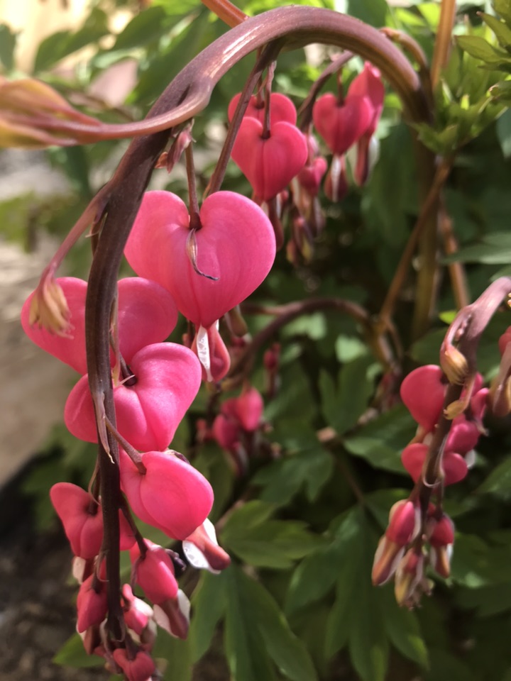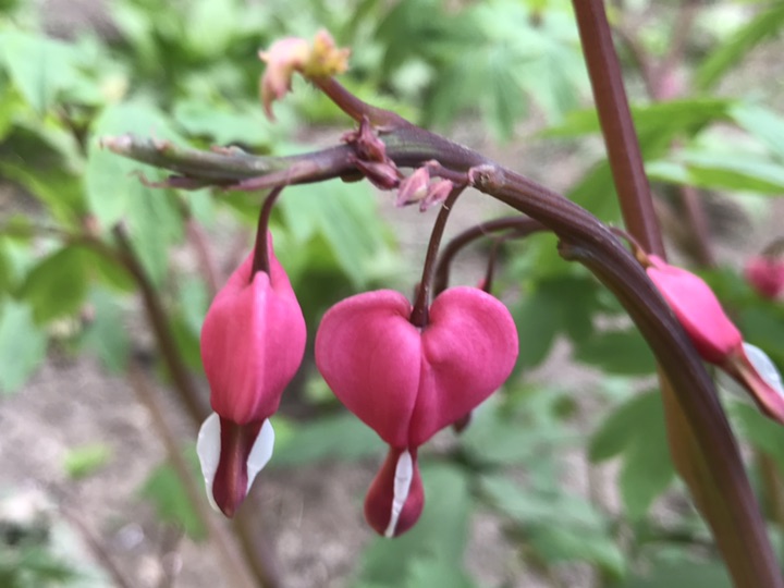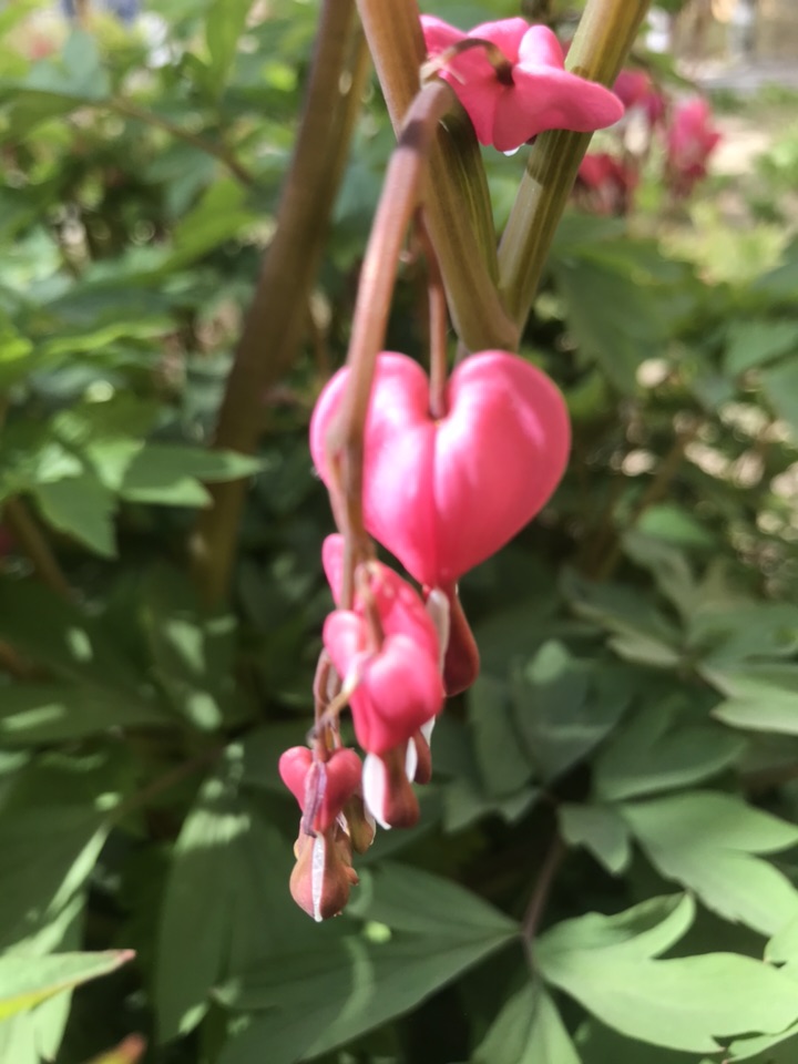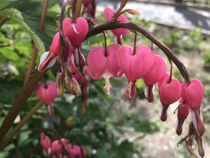 荷包牡丹,叶如牡丹,花似荷包,而我最喜欢它半开的样子,粉粉嫩嫩的玲珑心,一串串弯坠成爱的彩虹……