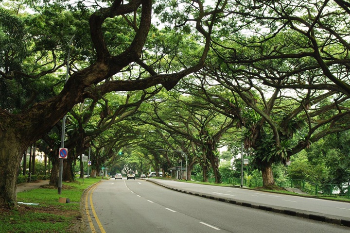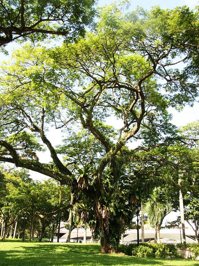 雨树(学名:Samanea saman (Jacq.) Merr.)是豆科雨树属植物,无刺大乔木;树冠极广展,干高10-25米,分枝甚低;总叶柄长15-40厘米,羽片及叶片间常有腺体。花玫瑰红色,组成单生或簇生、直径5-6厘米的头状花序,生于叶腋。果瓣厚,绿色,肉质,成熟时变成近木质,黑色;种子约25颗,埋于果瓤中。