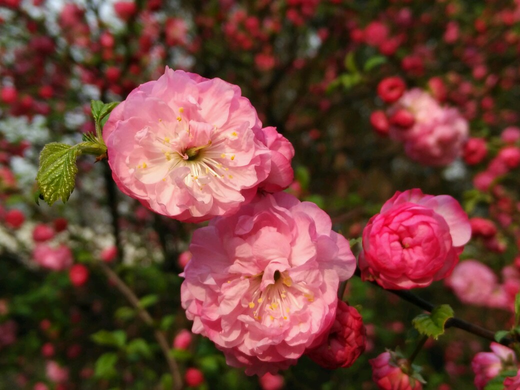 每年4月初,天气转暖,仿佛一夜之间,榆叶梅的花就开了大半,热烈而奔放。粉红色的花朵之间夹杂着嫩绿的新叶,十分好看。它的叶子像榆树叶,它的花像梅花,因此称它榆叶梅。