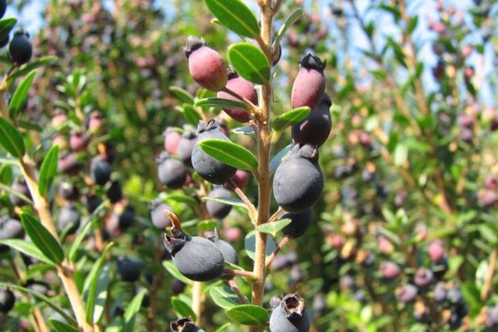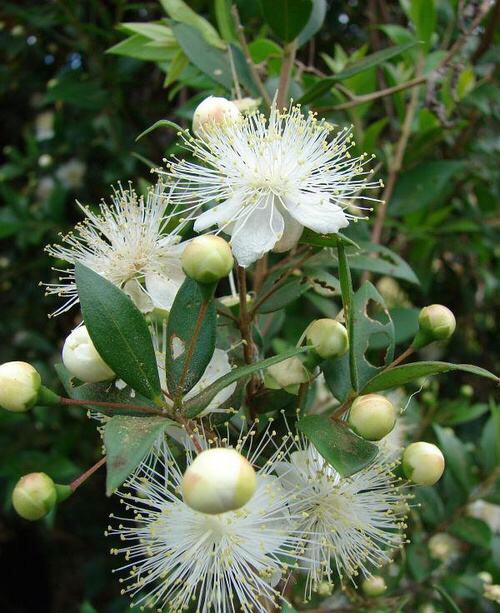 香桃木(学名:Myrtus communis Linn.)桃金娘科常绿灌木,或有时为高达5米的小乔木;枝四棱,幼嫩部分稍被腺毛;叶芳香,革质,叶片卵形至披针形,顶端渐尖,基部楔形。花芳香,中等大,被腺毛,花梗细长,花瓣5片,白色或淡红色,较大,倒卵形。浆果圆形或椭圆形,大如豌豆,蓝黑色或白色,顶部有宿萼。