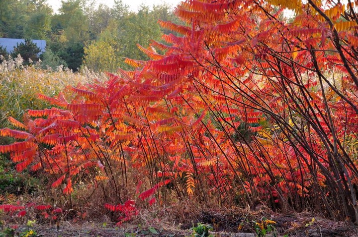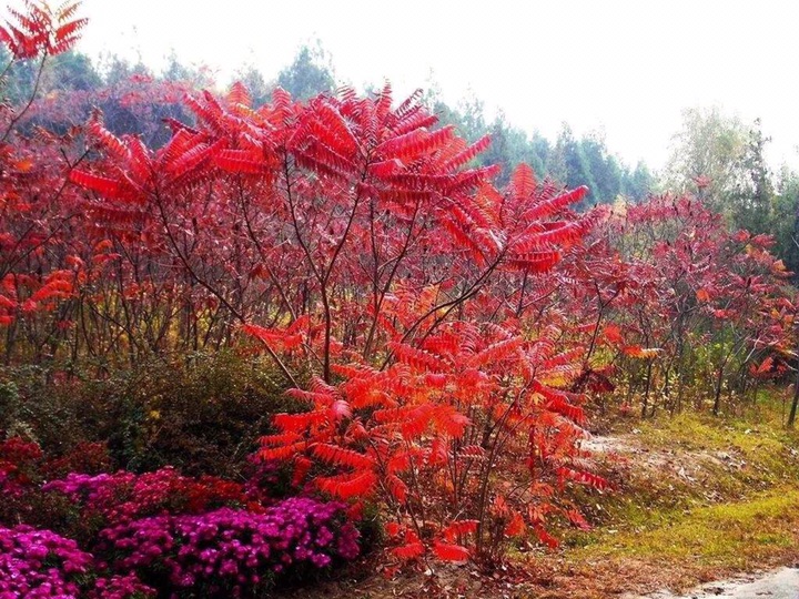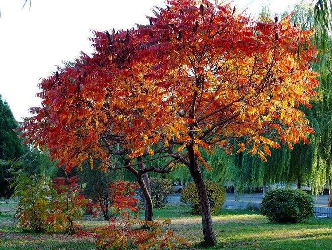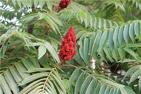 火炬树,(学名:Rhus Typhina),为双子叶植物纲、无患子目、漆树科、盐肤木属落叶小乔木。奇数羽状复叶互生,长圆形至披针形。直立圆锥花序顶生,果穗鲜红色。果扁球形,有红色刺毛,紧密聚生成火炬状。果实9月成熟后经久不落,而且秋后树叶会变红,十分壮观。原产欧美,常在开阔的沙土或砾质土上生长。