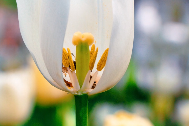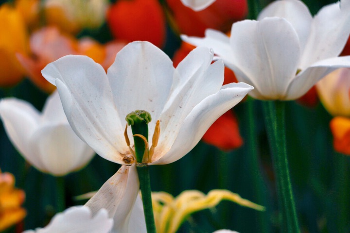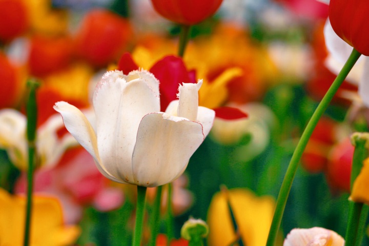 郁金香花色素雅秀丽,花朵端庄诱人,春色满园。蝴蝶驻足其间翩翩起舞,似乎也被这里如画的秀景所沉迷。