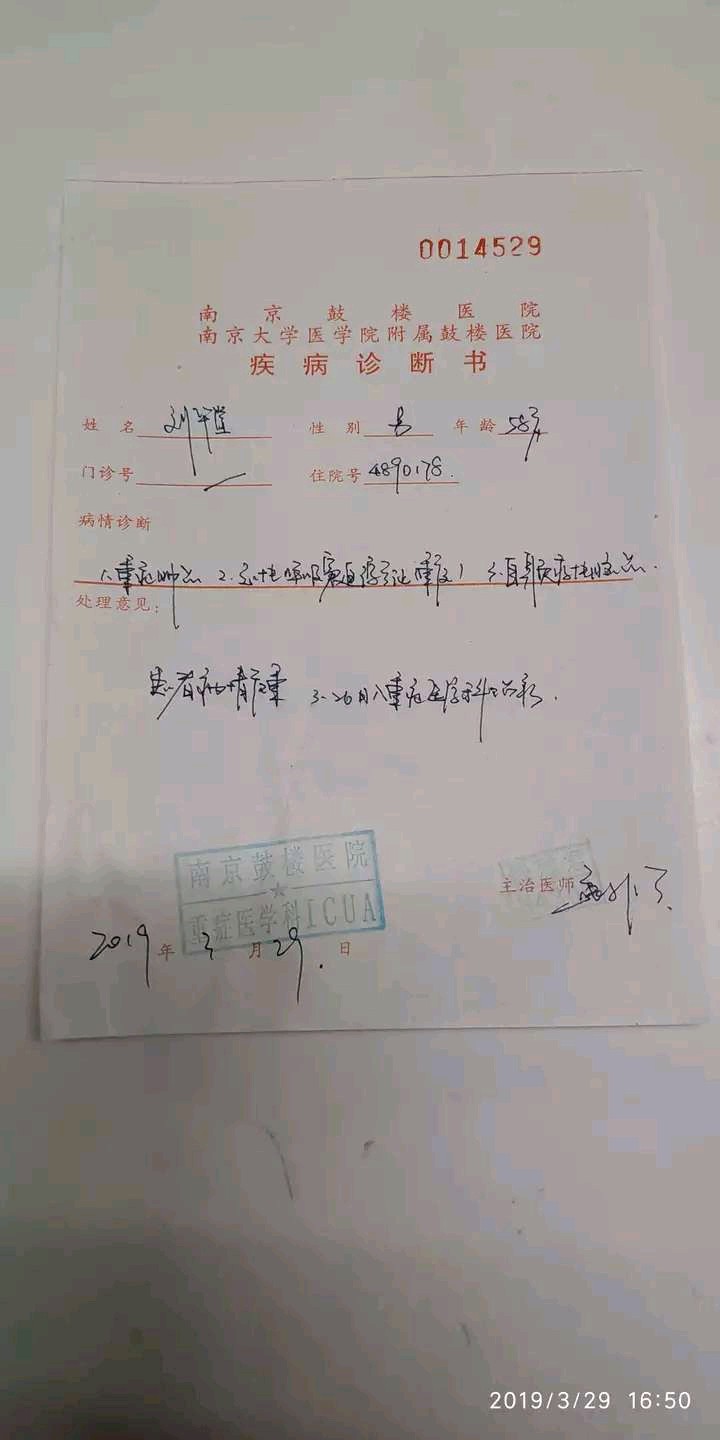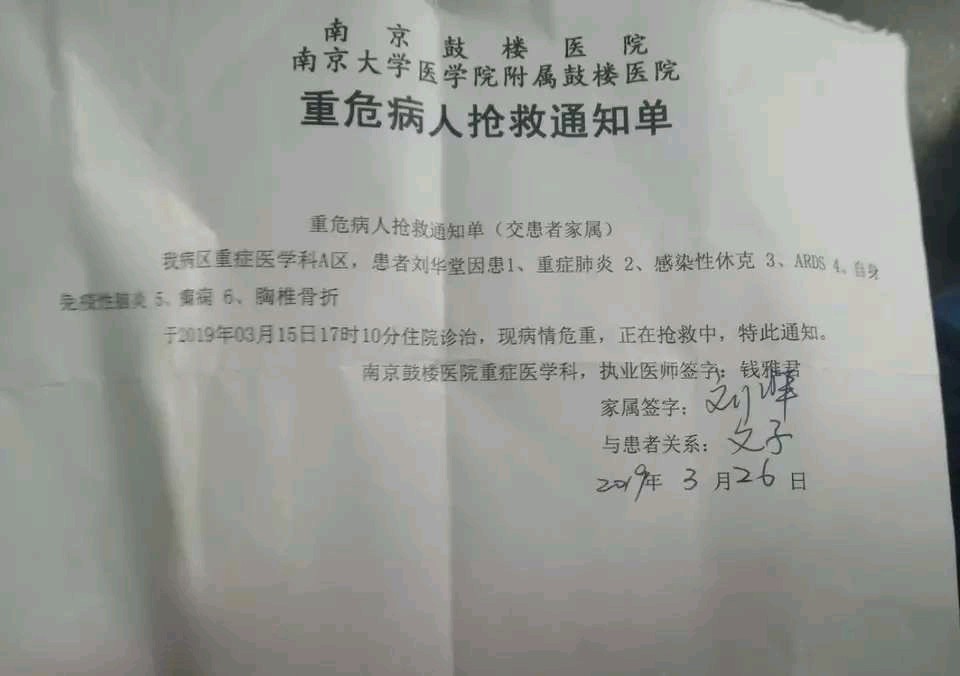 天有不测风云,2019年3月15日上午,我的爸爸刘华堂在工作中,突然晕倒在垃圾房内,被120急救车送到南京鼓楼医院,被确诊为重度肺炎。几天时间,医生进行了两次手术,但他仍然处于晕迷不醒的状态。医生说这种情况治疗最理想的状态是瘫痪,但植物人几率高达百分之八十。