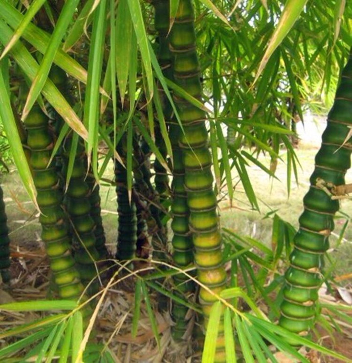 佛肚竹(学名:Bambusa ventricosa McClure):为禾本科丛生型竹类植物。幼秆深绿色,稍被白粉,老时转榄黄色。秆二型:正常圆筒形,高7-10米,节间30-35厘米;畸形秆通常25-50厘米,节间较正常短。箨叶卵状披针形;箨鞘无毛;箨耳发达,圆形或卵形至镰刀形;箨舌极短。