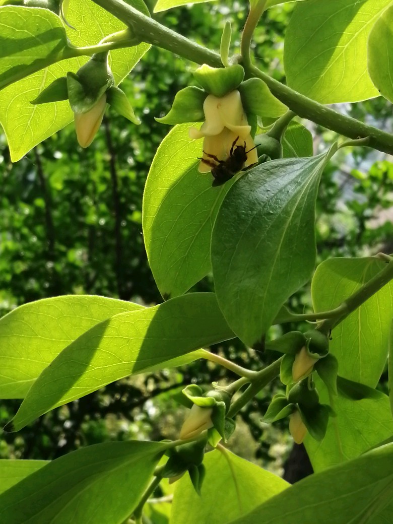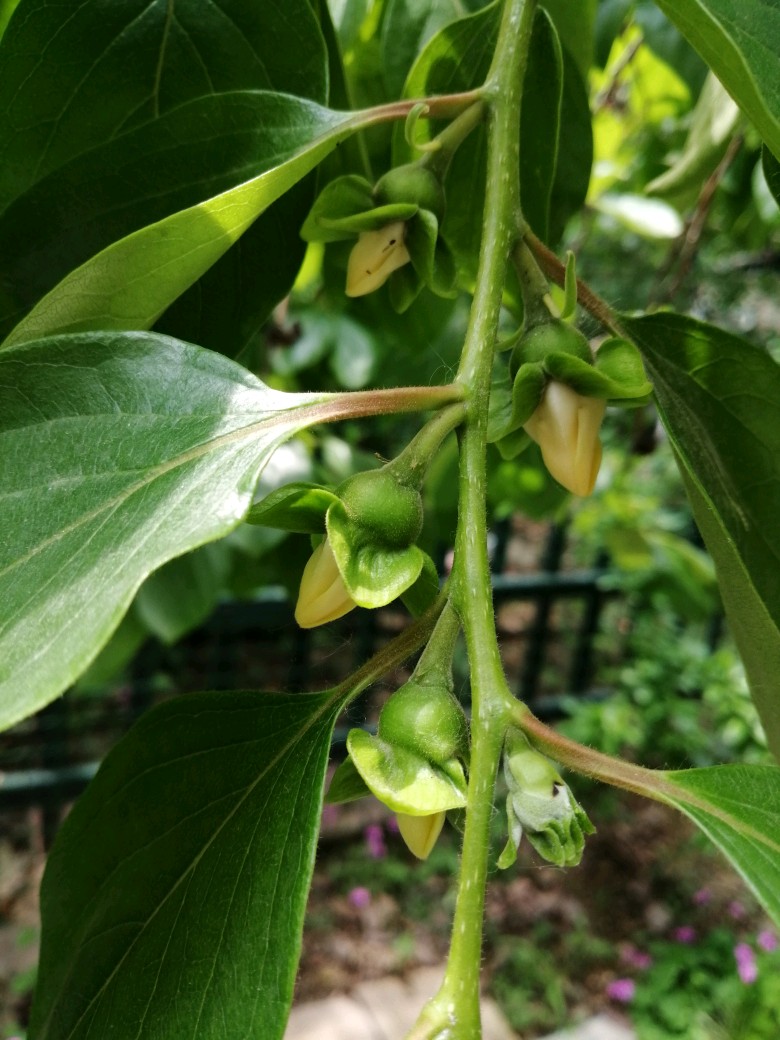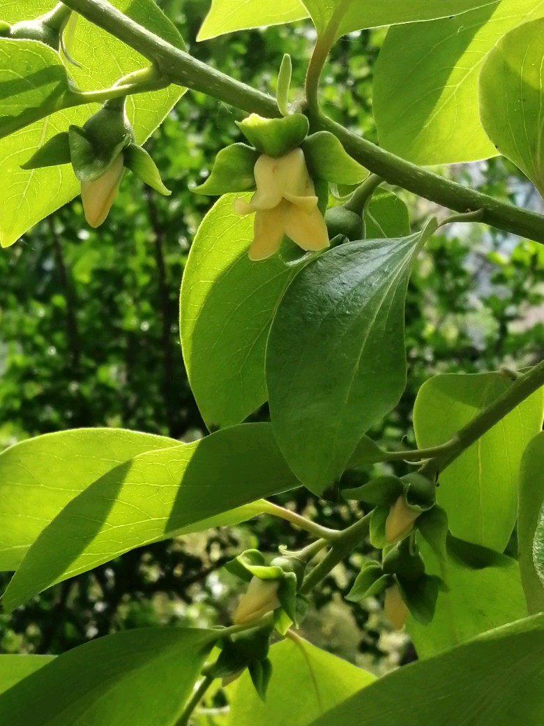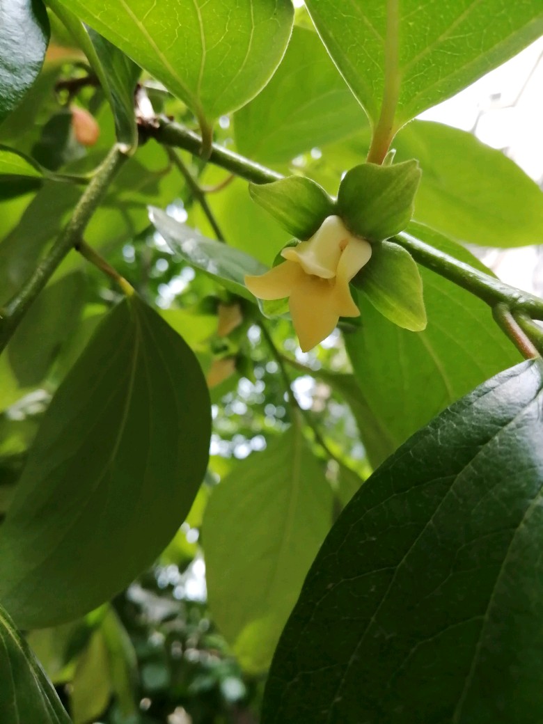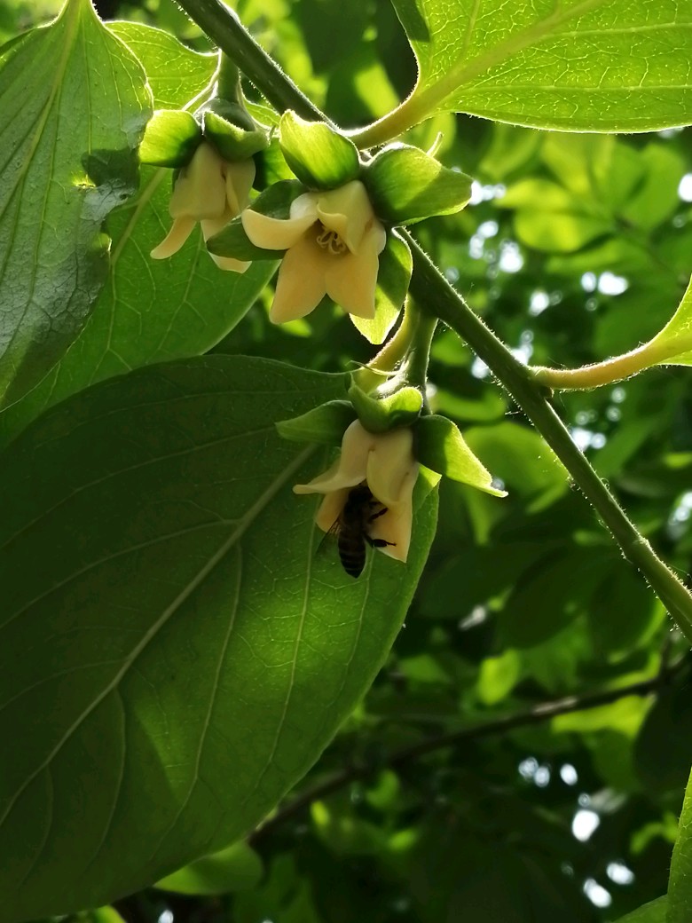 柿子树开花了,绿色的花托,鹅黄色的花瓣,吸引着小蜂来采蜜,秋天的柿子一定会很甜。