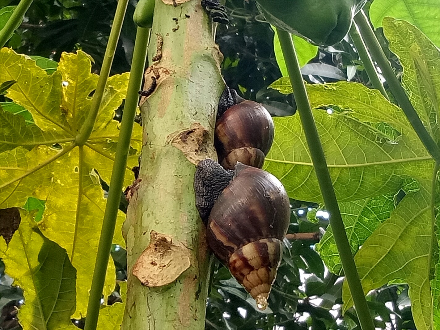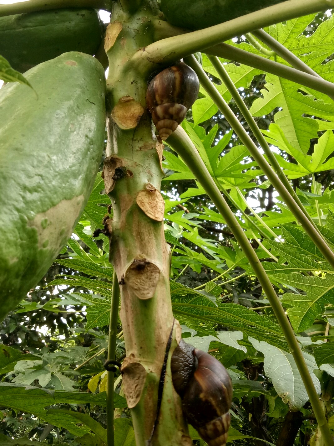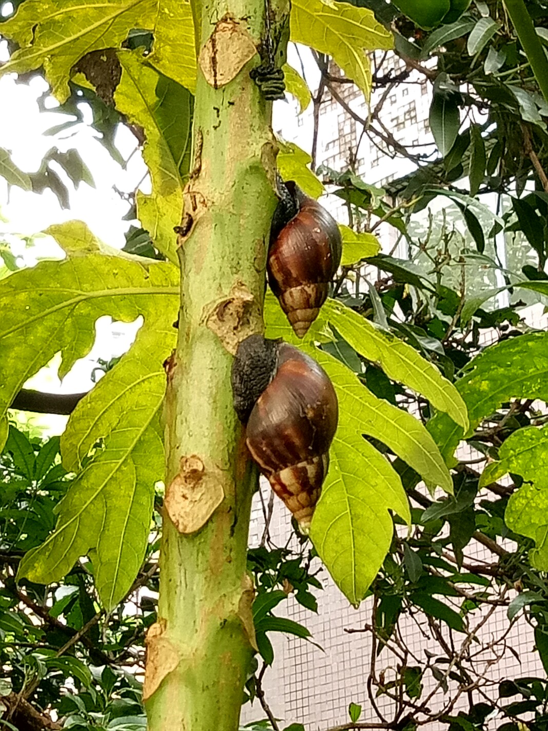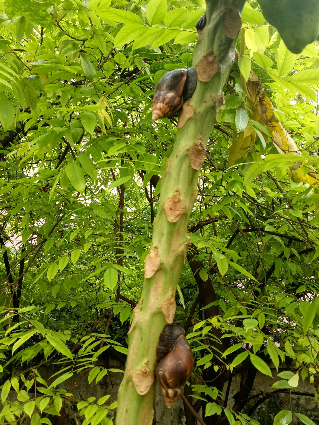现在的东风螺成精了!背着沉重的躯壳爬到3米高的番木瓜树上。😃😃😃
