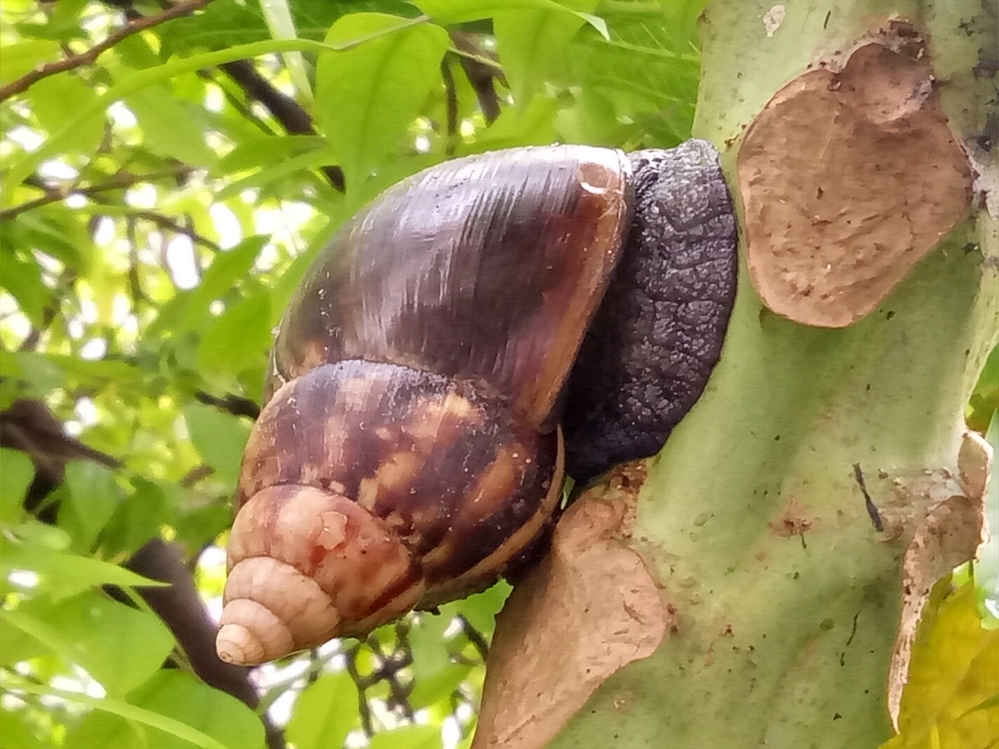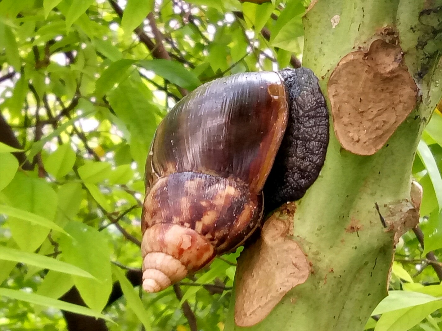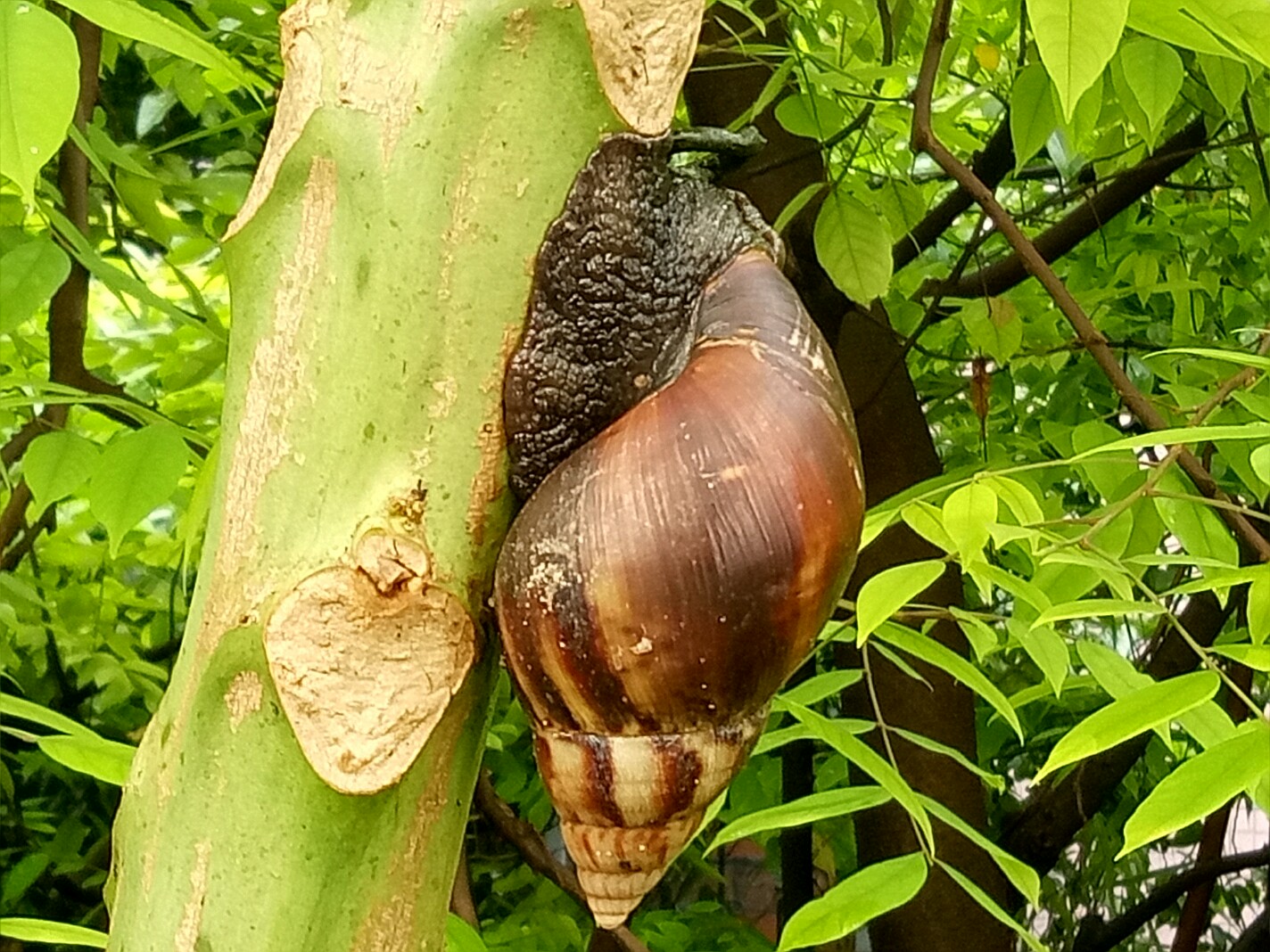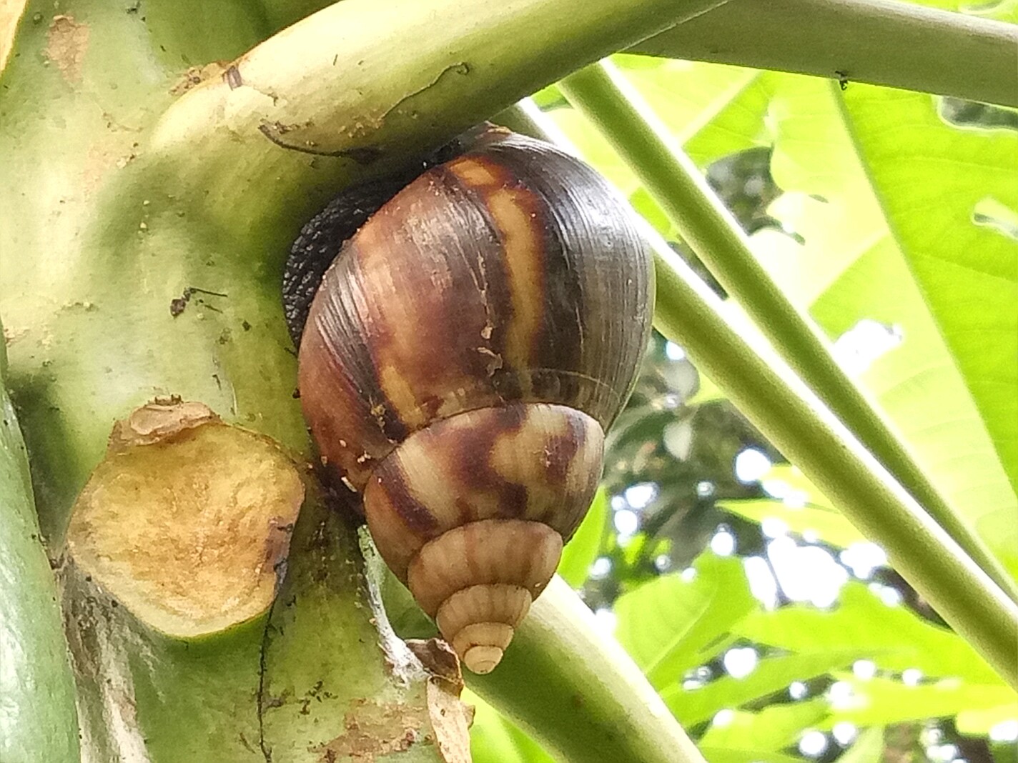 现在的东风螺成精了!背着沉重的躯壳爬到3米高的番木瓜树上。😃😃😃