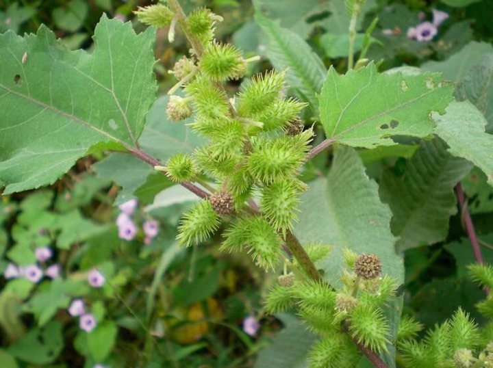 苍耳(学名:Xanthium sibiricum Patrin ex Widder)是菊科,苍耳属一年生草本植物,高可达90厘米。根纺锤状,茎下部圆柱形,上部有纵沟,叶片三角状卵形或心形,近全缘,边缘有不规则的粗锯齿,上面绿色,下面苍白色,被糙伏毛。雄性的头状花序球形,总苞片长圆状披针形,花托柱状,托片倒披针形,花冠钟形,花药长圆状线形;雌性的头状花序椭圆形,外层总苞片小,披针形,喙坚硬,锥形,瘦果倒卵形。
