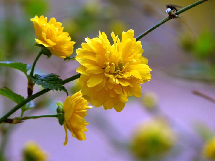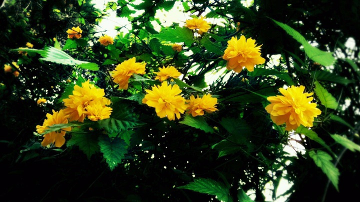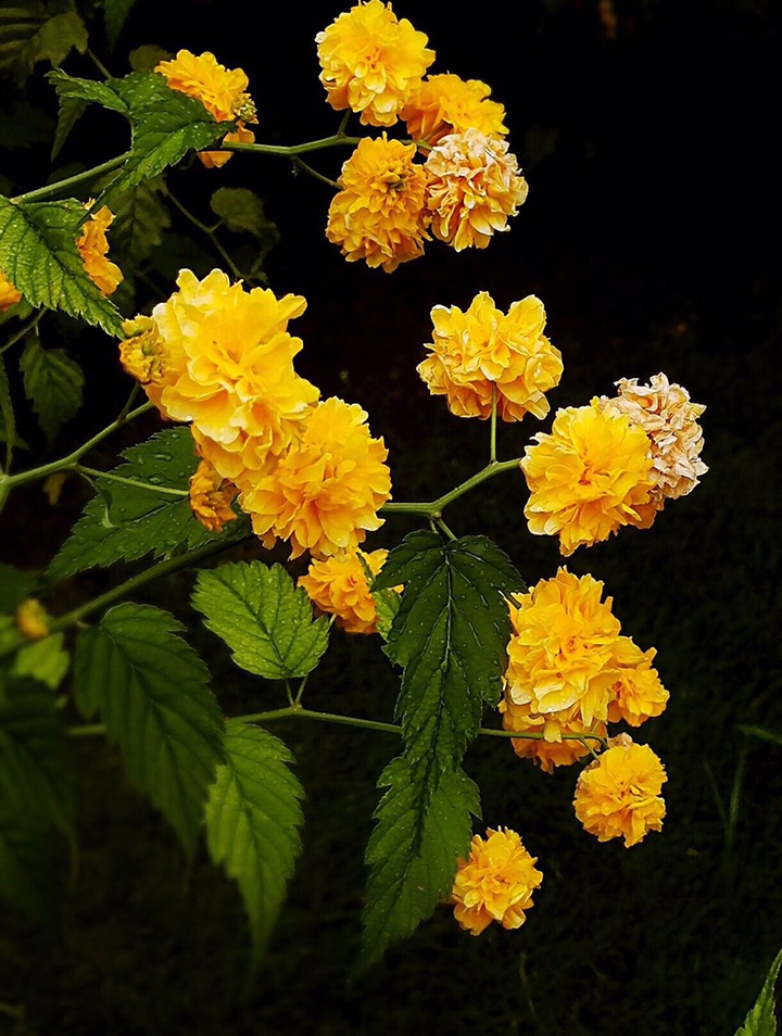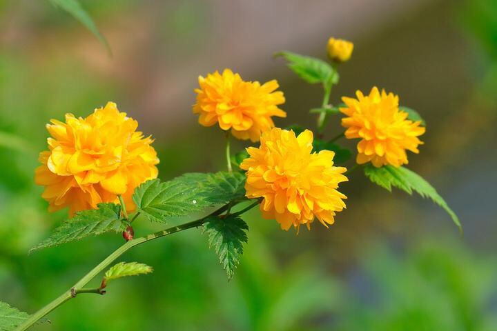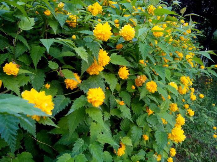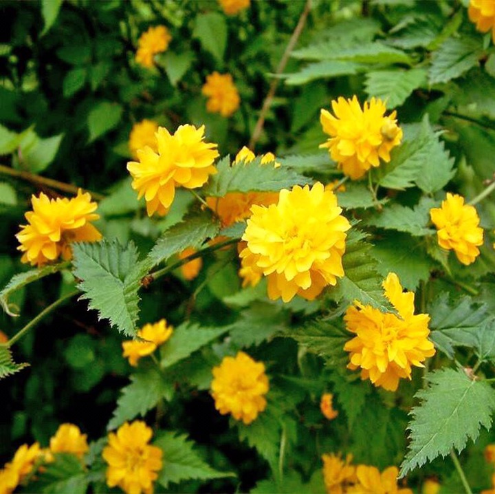 棣棠花(学名:Kerria japonica (L.) DC.):灌木,高1-2米;小枝有棱,绿色,无毛。叶卵形或三角形,先端渐尖,基部截形或近圆形,边缘有重锯齿,上面无毛或有稀疏短柔毛,下面微生短柔毛;叶柄无毛;有托叶。花单生于侧枝顶端;无毛;花直么3-5厘米;萼筒扁平,裂片5,卵形,全缘,无毛;花瓣黄色,宽椭圆形;雄蕊多数,离生,长约花瓣之半;心皮5-8,有柔毛,花柱约与雄蕊等到长。瘦查黑色,无毛,萼裂片宿存。