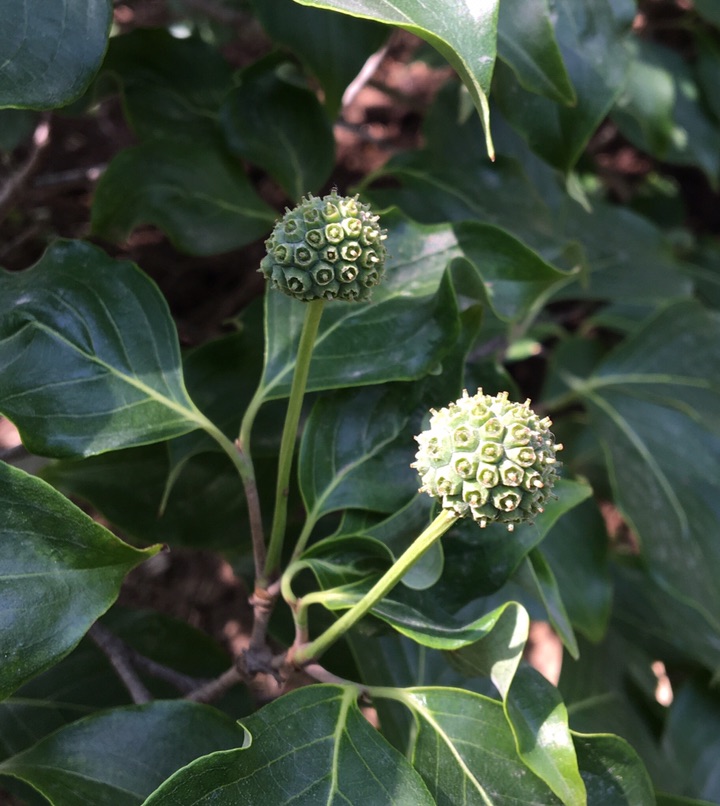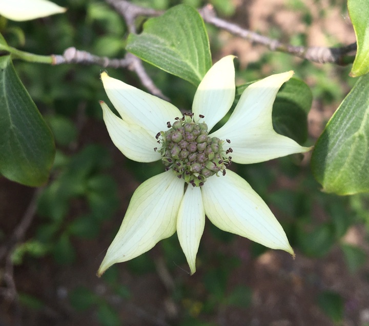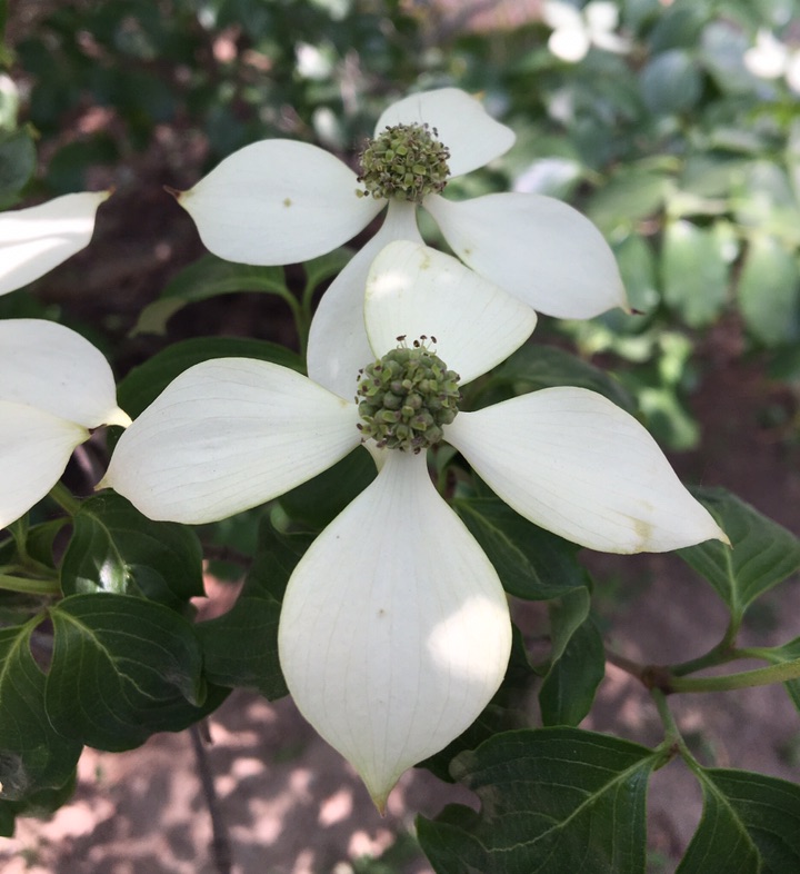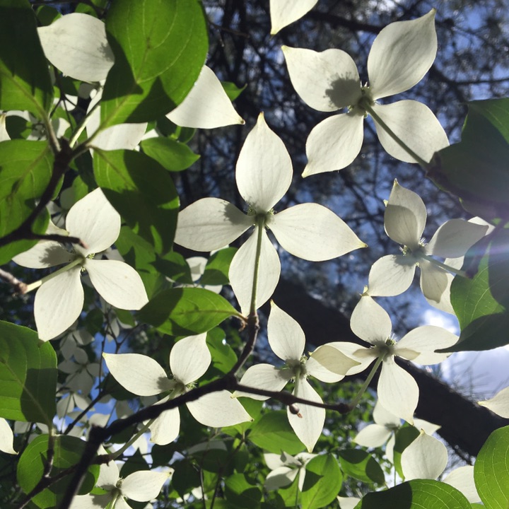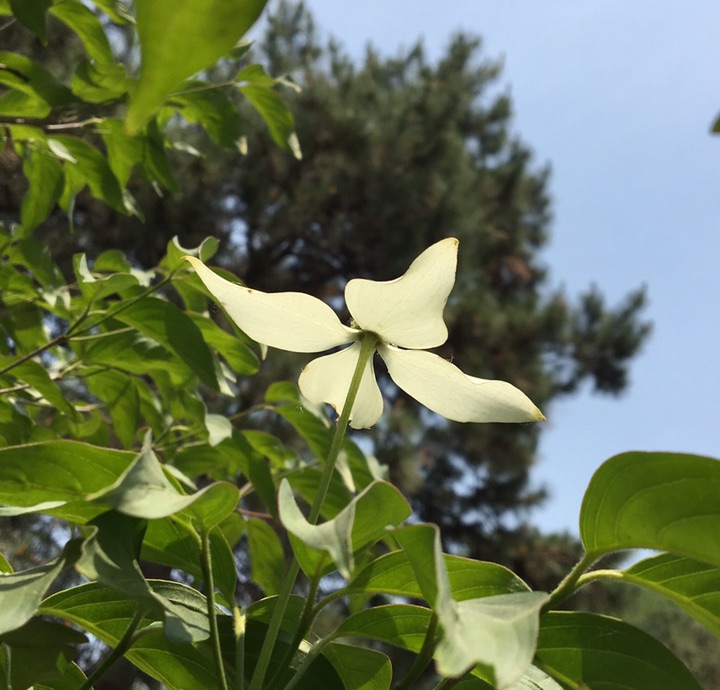 由于心情过于喜悦,我绕着树前后左右不停地观看和拍照,得意之余,竟发现旁边还有一棵四照花树,虽然长得稀疏,但比这一棵树高,更令人惊奇的是,树顶还长了几朵更富态的白花,可惜树太高,我只能站在树下仰望。