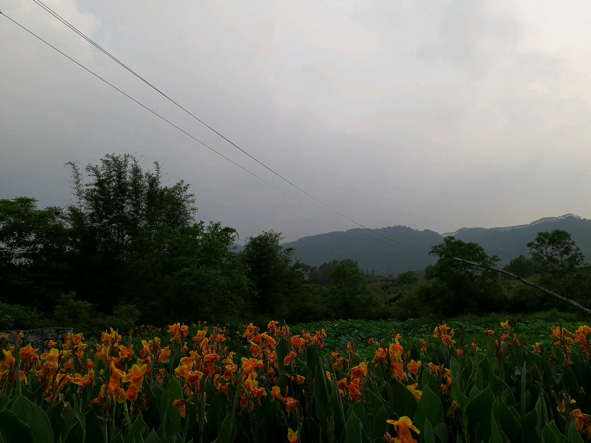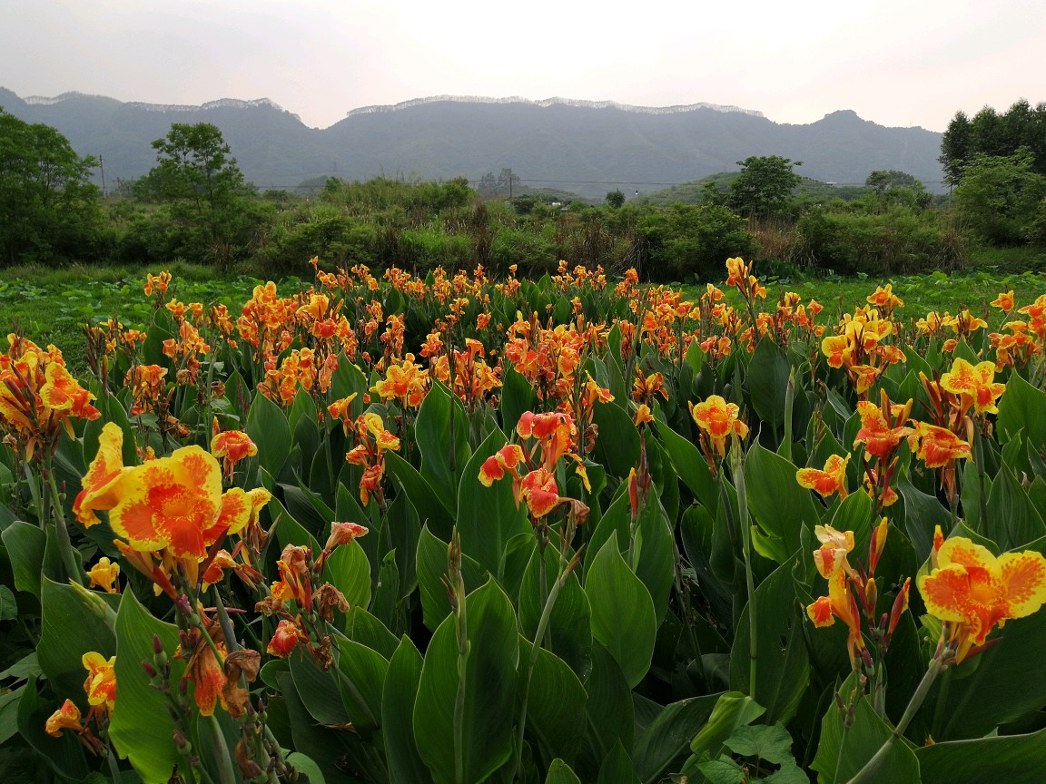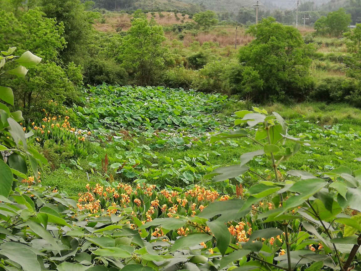 后院野生的美人蕉全开了,与荷塘的荷叶还挺衬景呢!
