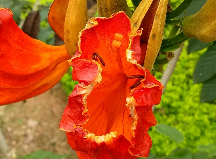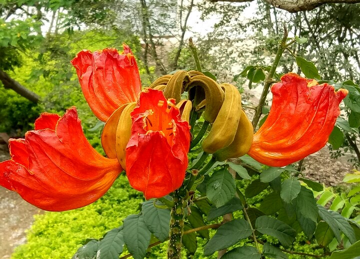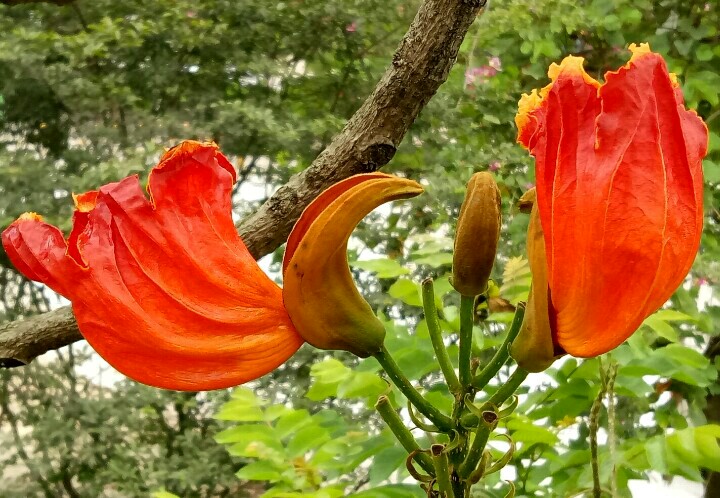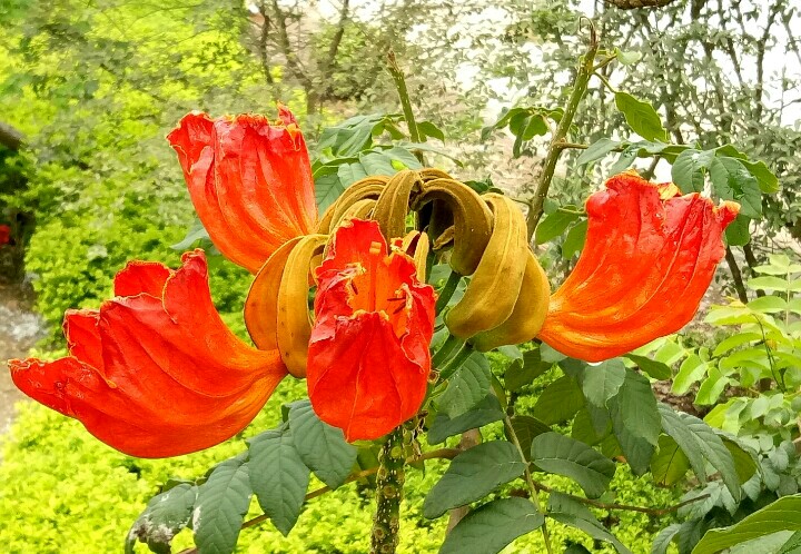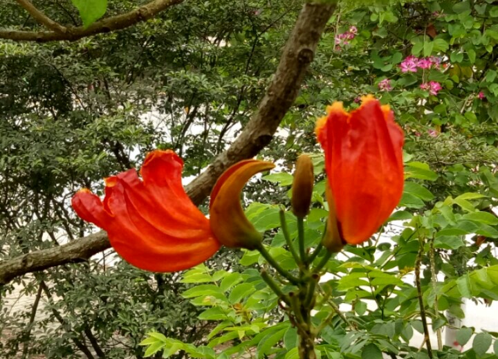 曾经在路上开车看见一棵树开的花红彤彤的,红得似火烧。没懂得去珍惜停车拍下来。待到整棵树剩稀疏的几朵时才停车拍摄,因为花太高,为有爬上树上拍。百度后才知道这叫火焰树,加蓬共和国的国树。别名:火烧花,喷泉树,苞萼木,火焰木。
