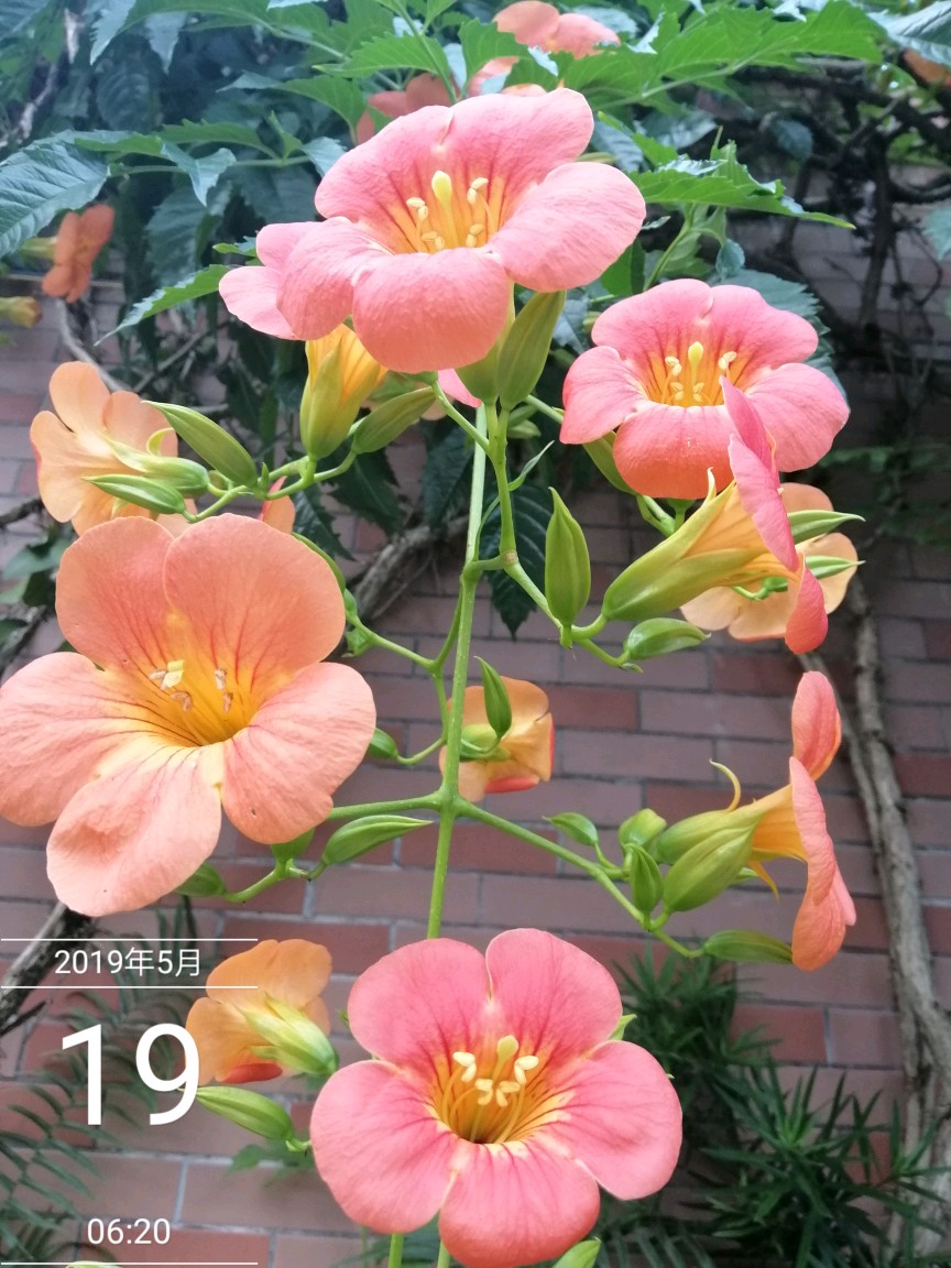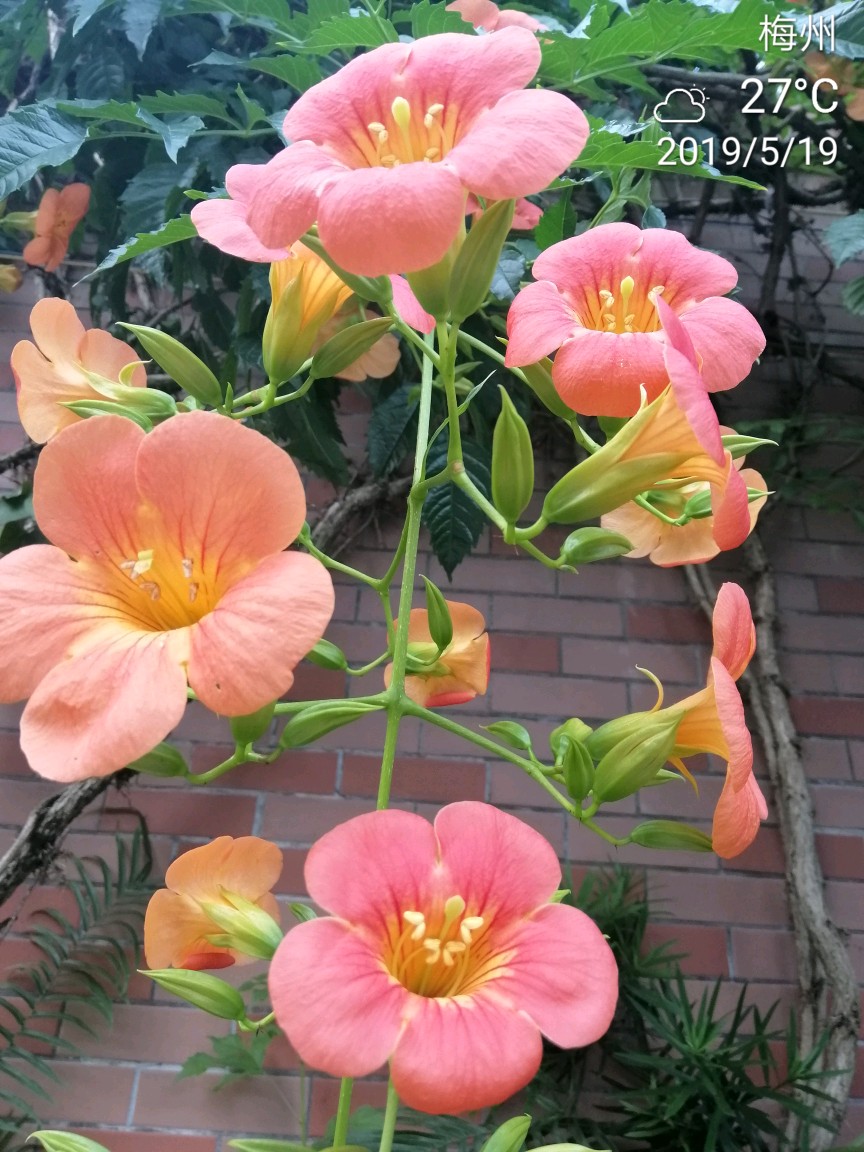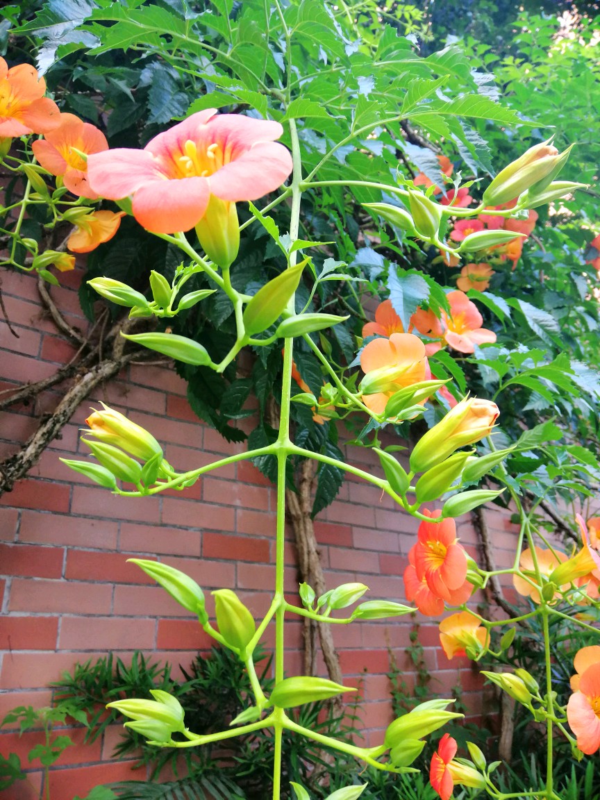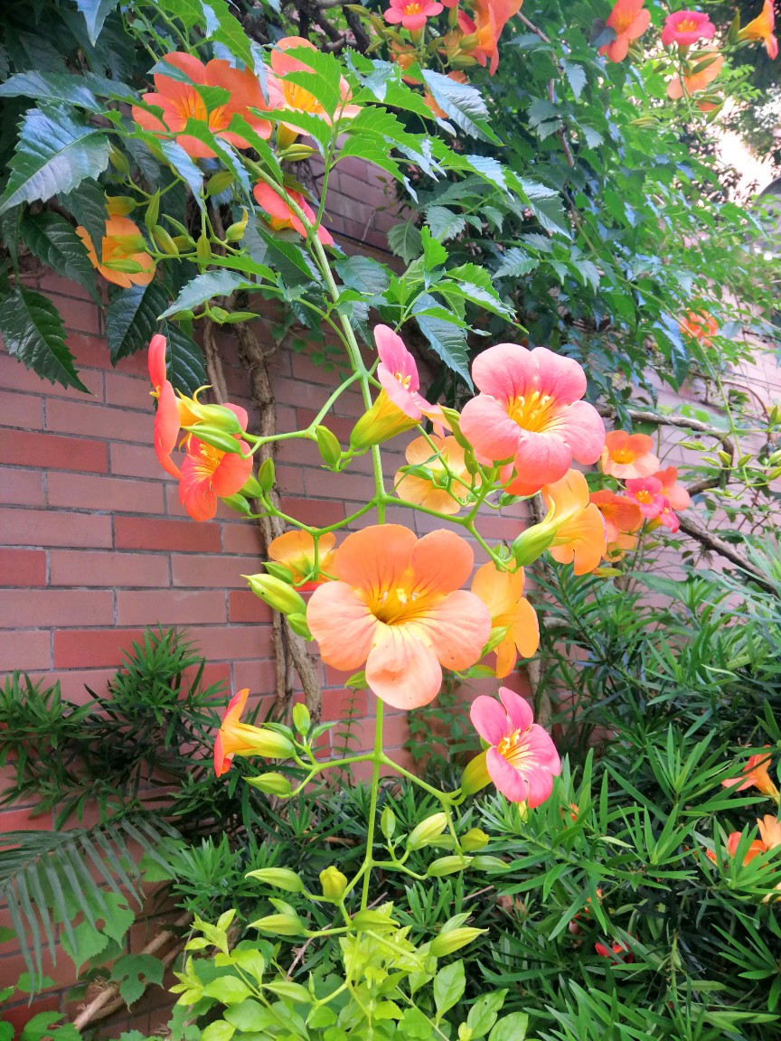 围墙边,有一棵凌霄藤,每到五月,凌霄准时开花。她攀援围墙而上,垂下长长的枝干,花儿迎风摇曳,极尽妍态!
