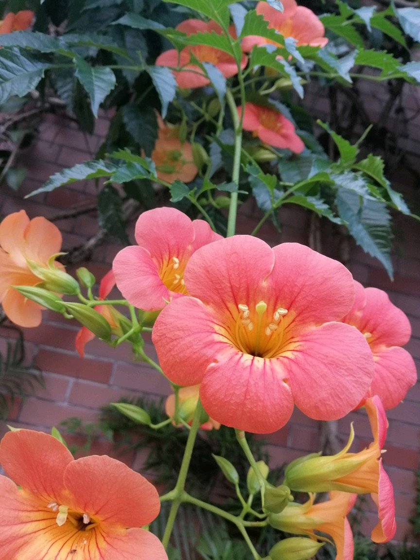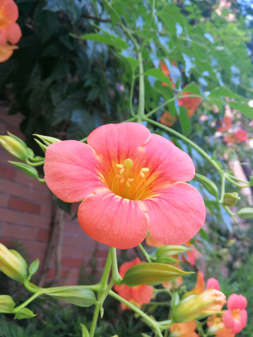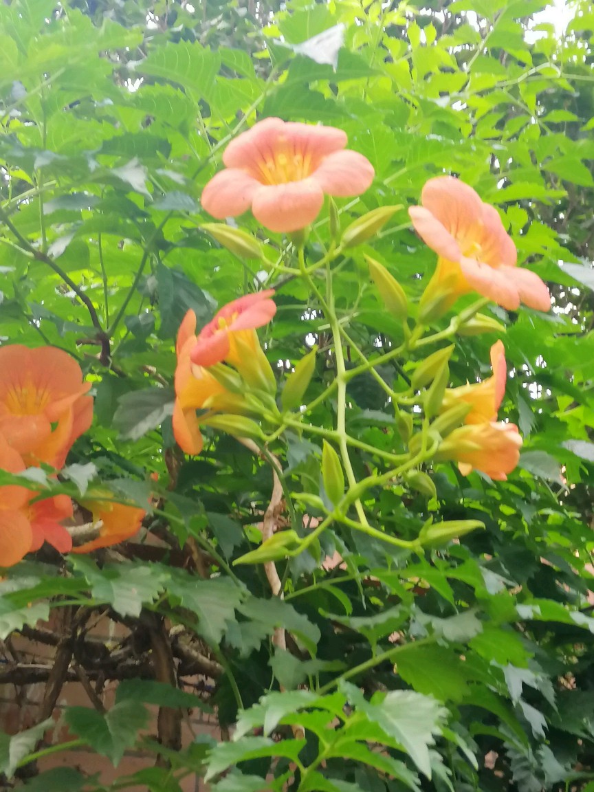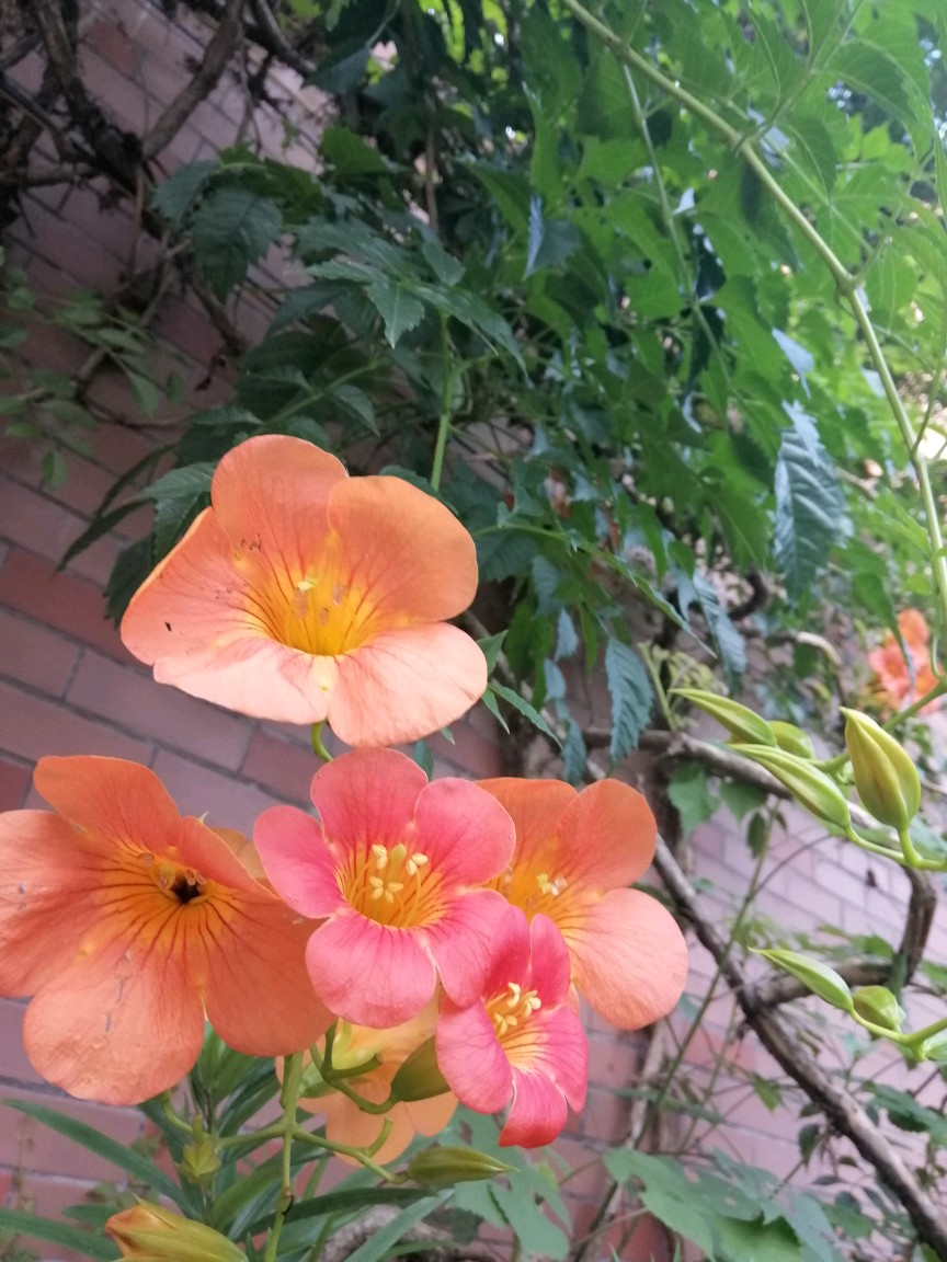 围墙边,有一棵凌霄藤,每到五月,凌霄准时开花。她攀援围墙而上,垂下长长的枝干,花儿迎风摇曳,极尽妍态!