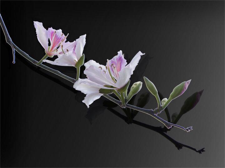 洋紫荆(学名:Bauhinia variegata L.):落叶乔木;树皮暗褐色,近光滑;幼嫩部分常被灰色短柔毛;枝广展,硬而稍呈之字曲折,无毛。叶近革质,广卵形至近圆形,宽度常超过于长度,先端2裂达叶长的1/3,裂片阔,钝头或圆,两面无毛或下面略被灰色短柔毛。总状花序侧生或顶生,极短缩,多少呈伞房花序式,少花,被灰色短柔毛;花大,近无梗;花蕾纺锤形;萼佛焰苞状,被短柔毛;花瓣倒卵形或倒披针形,长4-5厘米,具瓣柄,紫红色或淡红色,杂以黄绿色及暗紫色的斑纹。荚果带状,扁平;种子10-15颗,近圆形,扁平,直径约1厘米。花期全年,3月最盛。