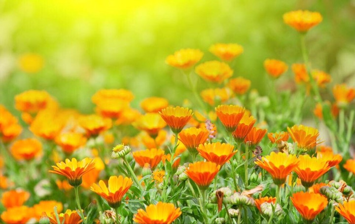 金盏花(Calendula officinalis L.),为菊科两年生草本,全株被毛。叶互生,长圆形。花黄色或橙黄色,花期4~9月,果期6~10月。喜生长于温和、凉爽的气候,怕热、耐寒。原产于南欧、地中海沿岸一带。