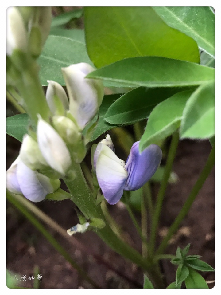 花冠蓝色至堇青色,无毛,旗瓣反折,龙骨瓣喙尖,先端呈蓝黑色。