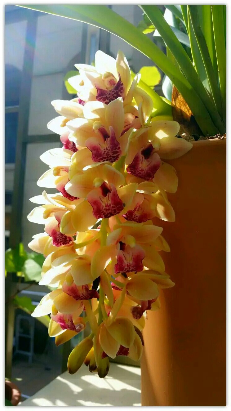 大花蕙兰,花色热烈浓艳,每个花枝上近二十个花蕾,渐次向上盛开,所以大花蕙兰又有步步高升的意思。