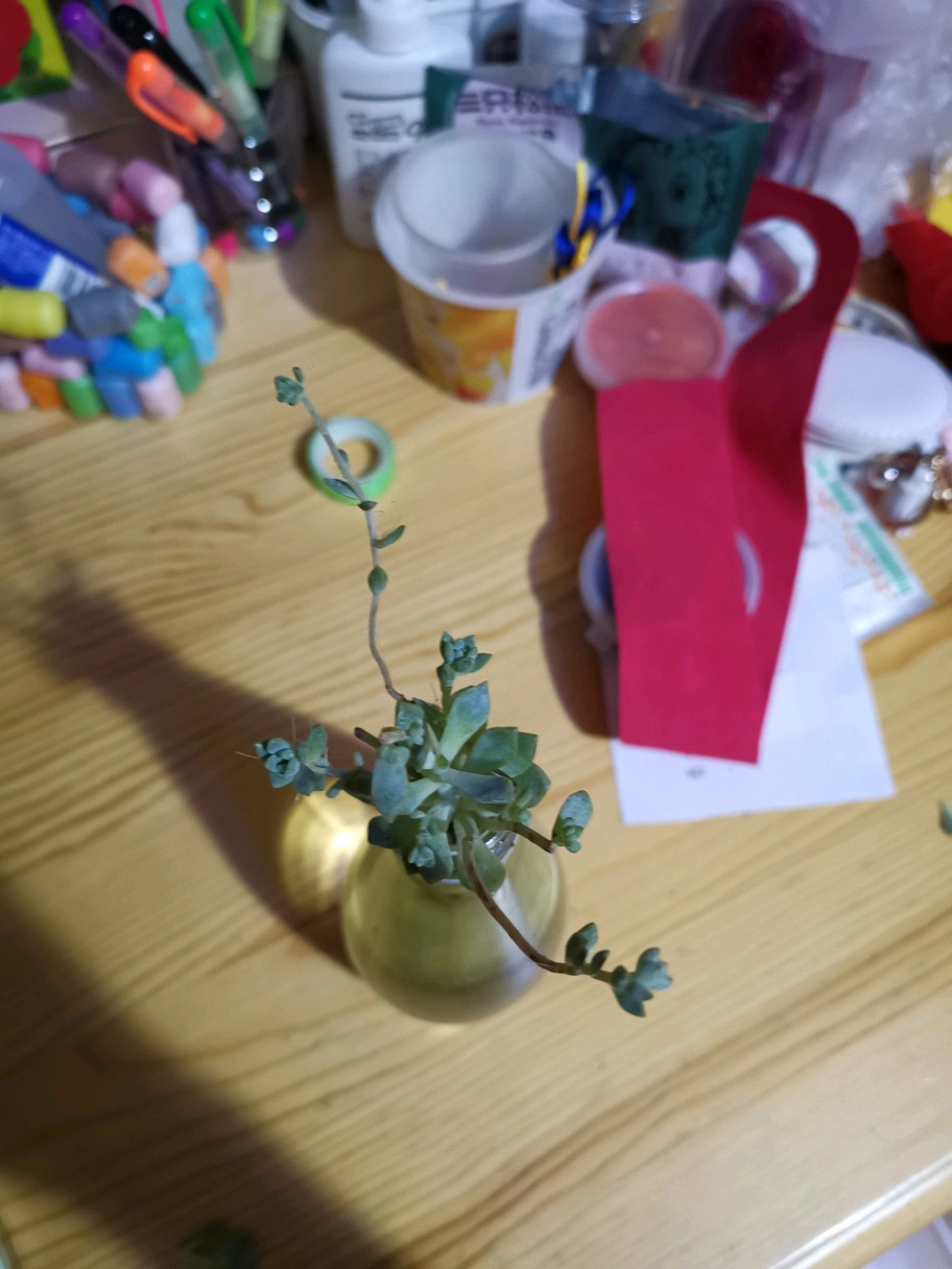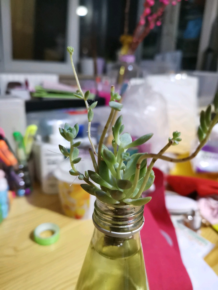 这个是所谓的子持白莲(其实我觉得买到冒牌货了),刚砍过头,一直状态不好。徒长,长气根,而且一种到土里就叶片缺水。现在只能水培,也不能一直水培吧。下面还有一张照片⬇️