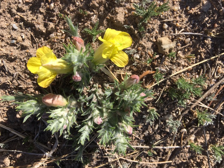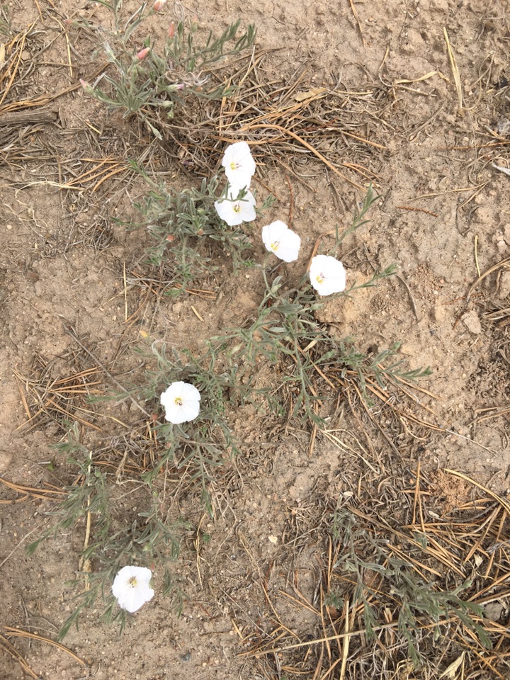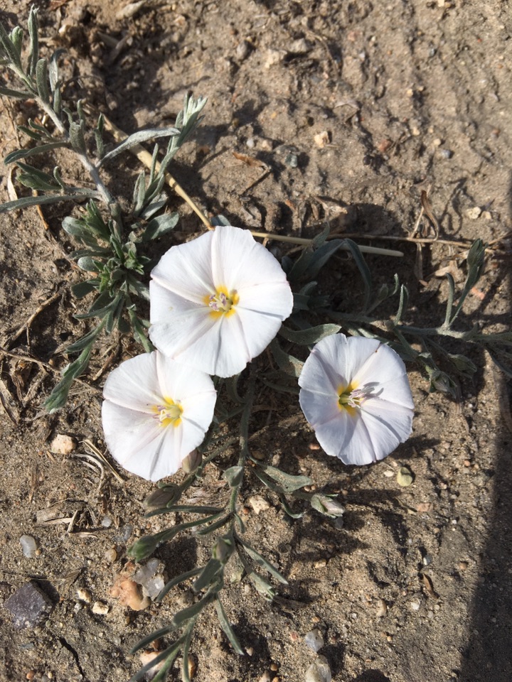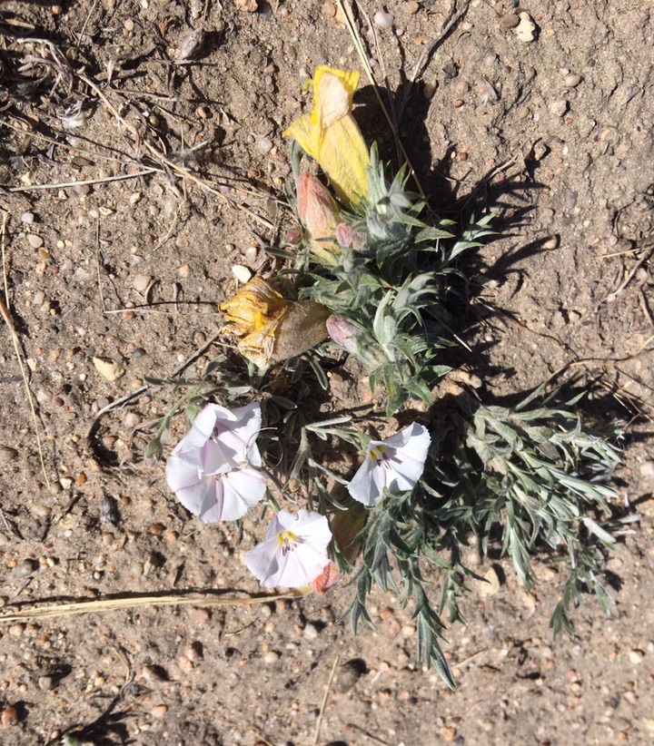 银灰田旋花和蒙古大黄花的枝叶都是呈银白色,而且都很小,刚离开地皮一到几厘米。开花之前,我以为是一种植物呢?现在都开花了才分清楚。