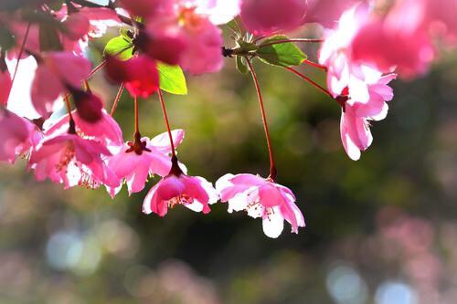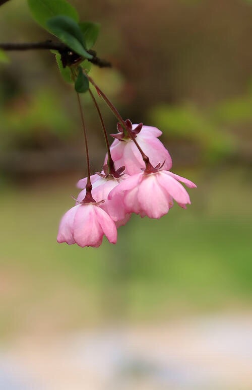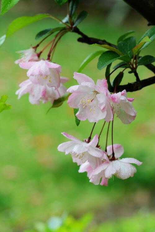 垂丝海棠(学名:Malus halliana Koehne)是落叶小乔木,高达5米,树冠开展;叶片卵形或椭圆形至长椭卵形,伞房花序,具花4-6朵,花梗细弱下垂,有稀疏柔毛,紫色;萼筒外面无毛;萼片三角卵形,花瓣倒卵形,基部有短爪,粉红色,常在5数以上;果实梨形或倒卵形,略带紫色,成熟很迟,萼片脱落。花期3-4月,果期9-10月。生山坡丛林中或山溪边,海拔50-1200米。分布于中国江苏、浙江、安徽、陕西、四川和云南。可入药,主治血崩。