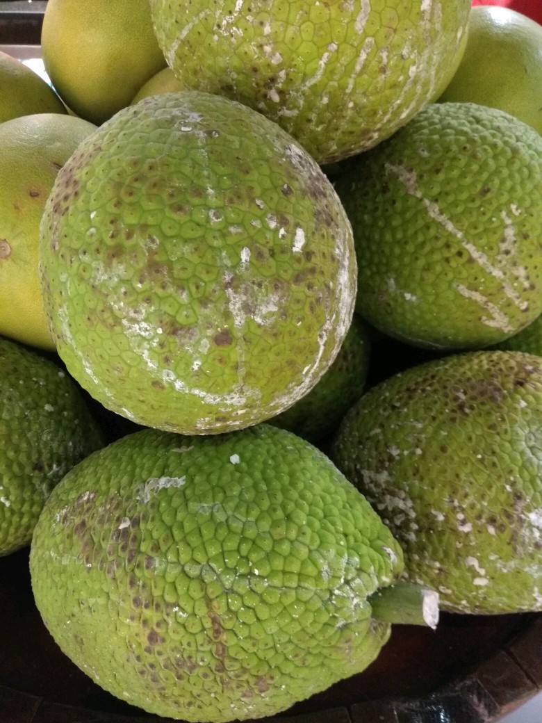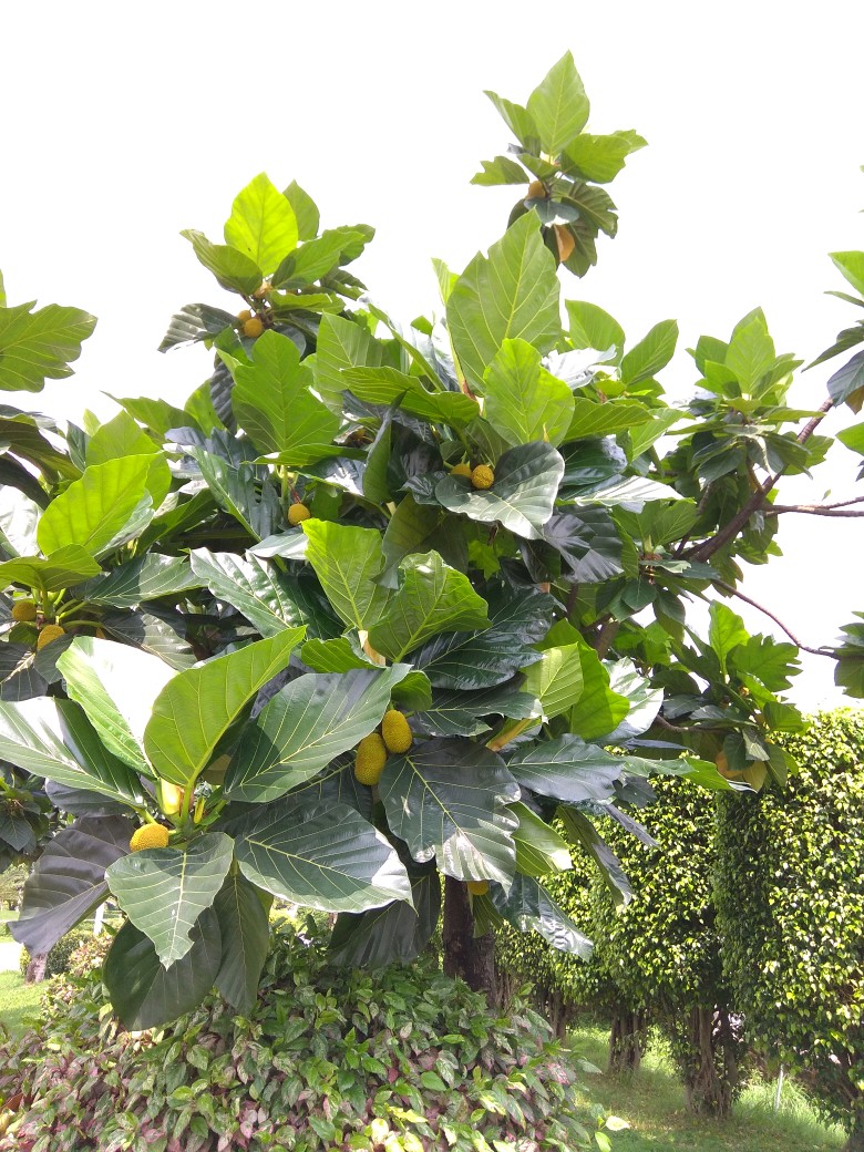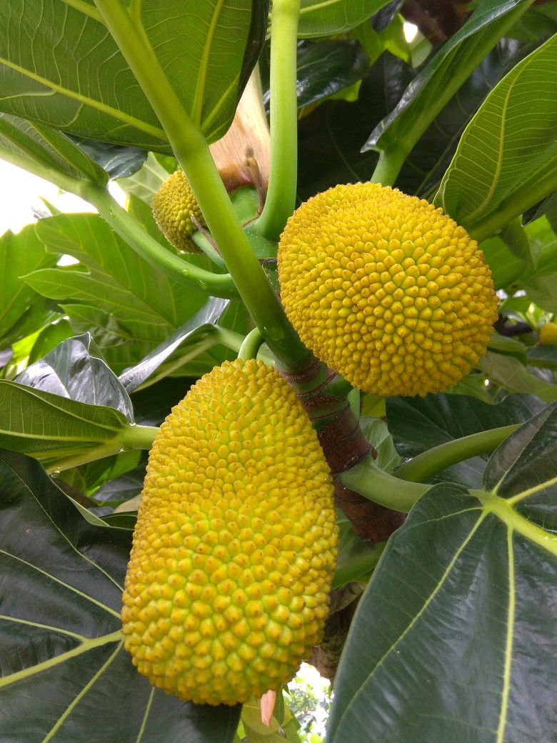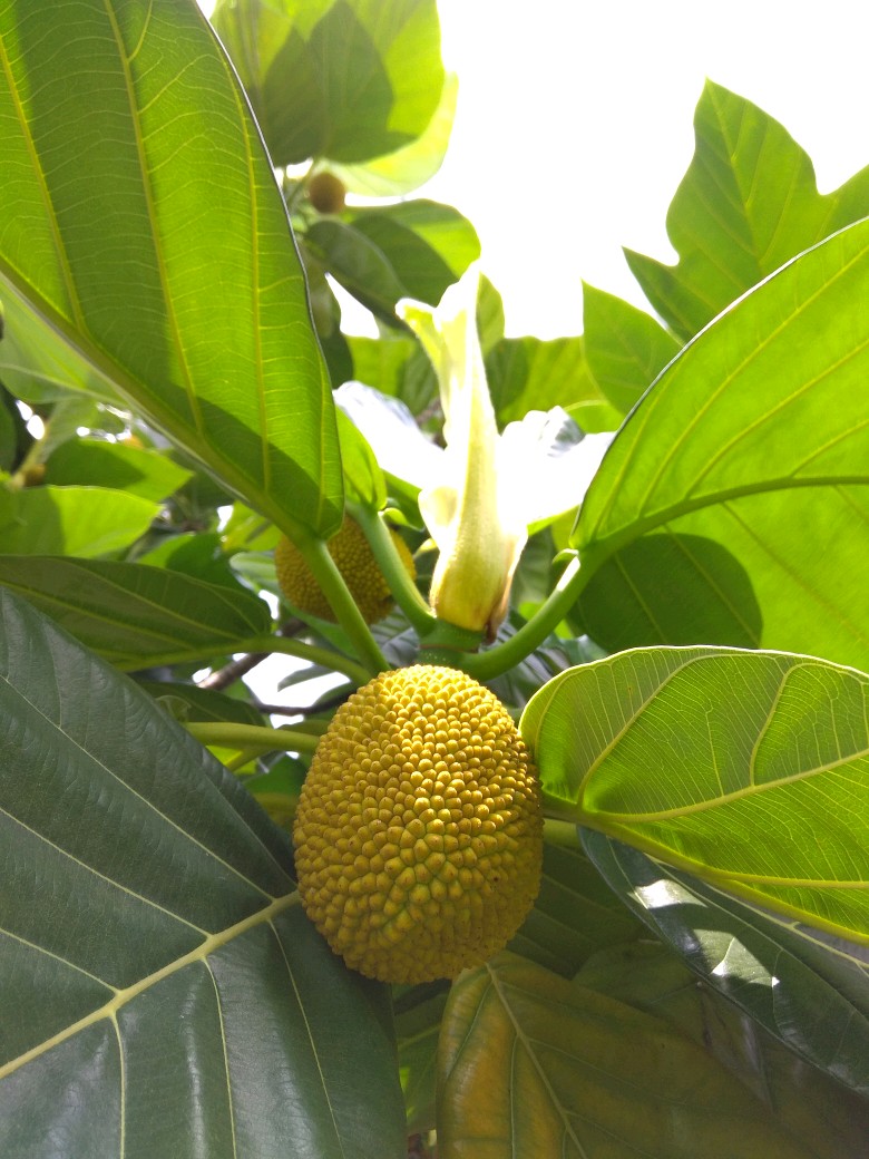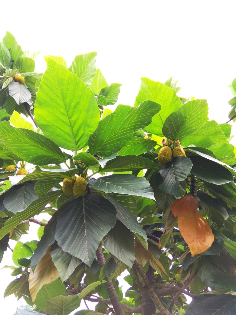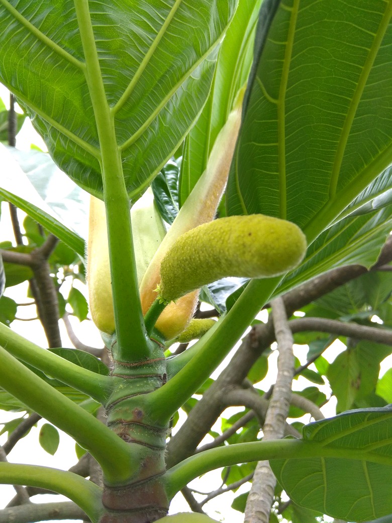 经过许多年,我常见的那几棵面包树今夏终于第一次开了花,今天,果实已有了拳头般大小,不由又想到了这一句~面包会有的!