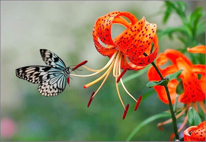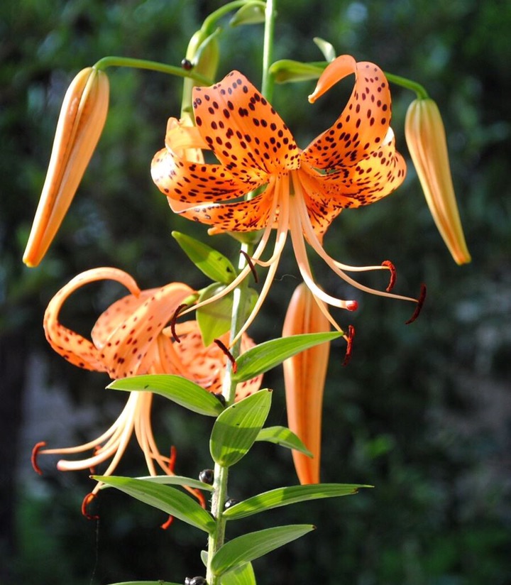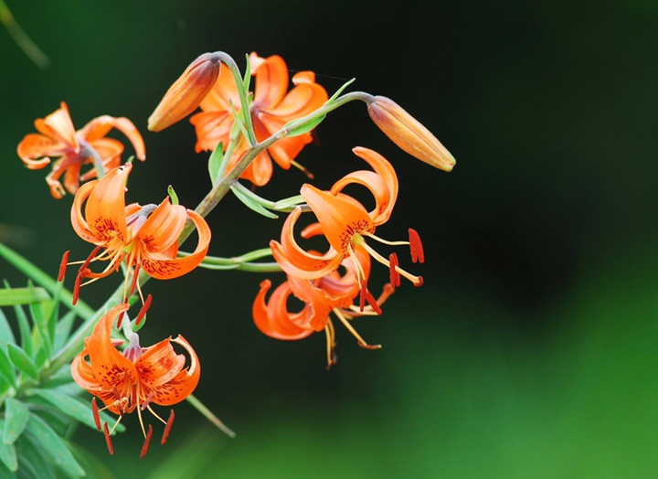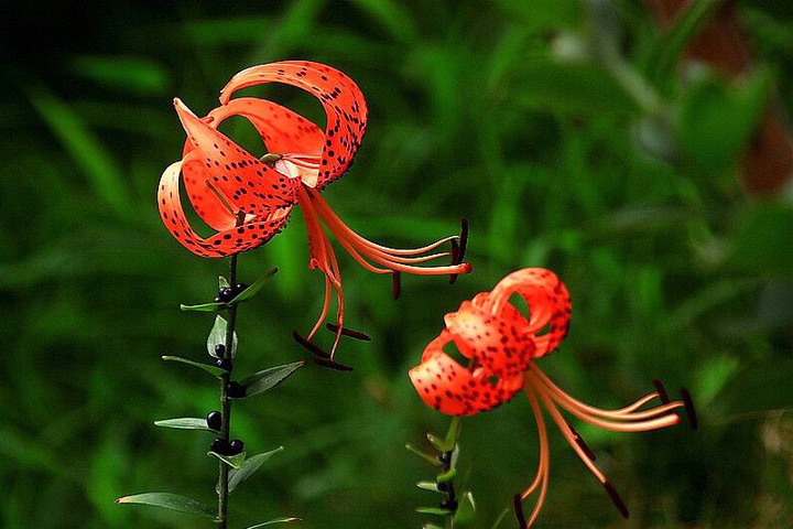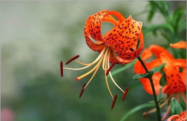 卷丹(学名:Lilium lancifolium Thunb.):卷丹花瓣有平展的,有向外翻卷的,故有“卷丹”美名。鳞茎近宽球形,高约3.5厘米,直径4-8厘米;鳞片宽卵形,长2.5-3厘米,宽1.4-2.5厘米,白色。茎高0.8-1.5米,带紫色条纹,具白色绵毛。叶散生,矩圆状披针形或披针形,两面近无毛,有5-7条脉。花3-6朵或更多;苞片叶状,卵状披针形;花下垂,花被片披针形,反卷,橙红色,有紫黑色斑点。蒴果狭长卵形,长3-4厘米。花期7-8月,果期9-10月。