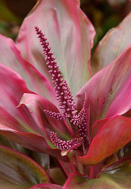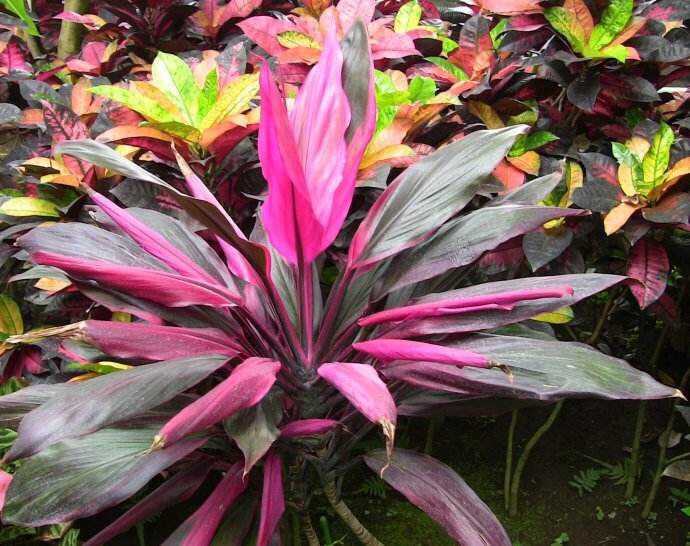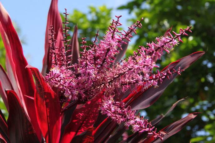 朱蕉(学名: Cordyline fruticosa(L.)A. Cheval)为龙舌兰科、朱蕉属直立灌木植物,高1-3米。茎粗1-3厘米,有时稍分枝。叶聚生于茎或枝的上端,绿色或带紫红色,叶柄有槽,抱茎。圆锥花序侧枝基部有大的苞片;花淡红色、青紫色至黄色;花梗通常很短;外轮花被片下半部紧贴内轮而形成花被筒,上半部在盛开时外弯或反折;雄蕊生于筒的喉部,稍短于花被;花柱细长。花期11月至次年3月。