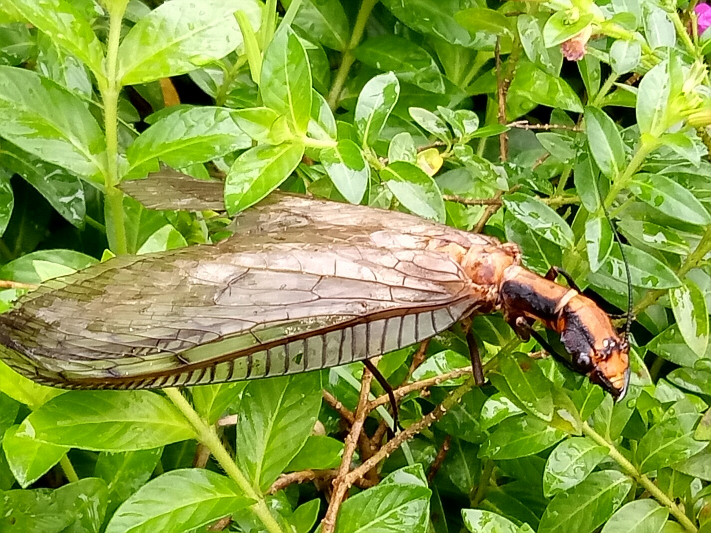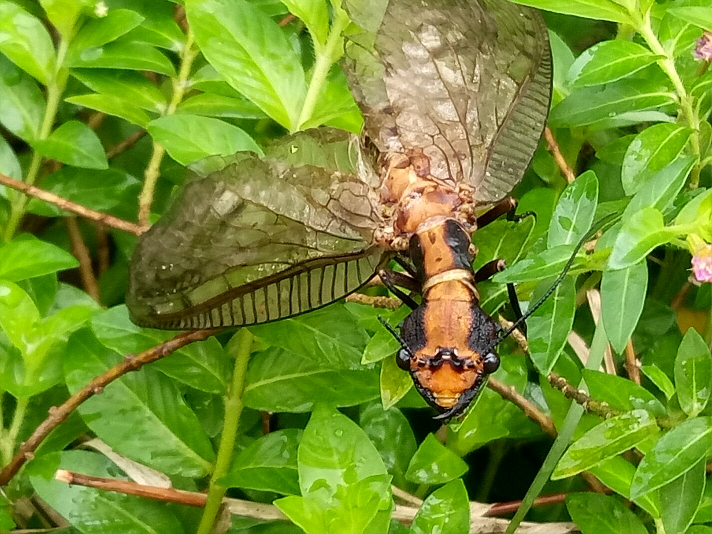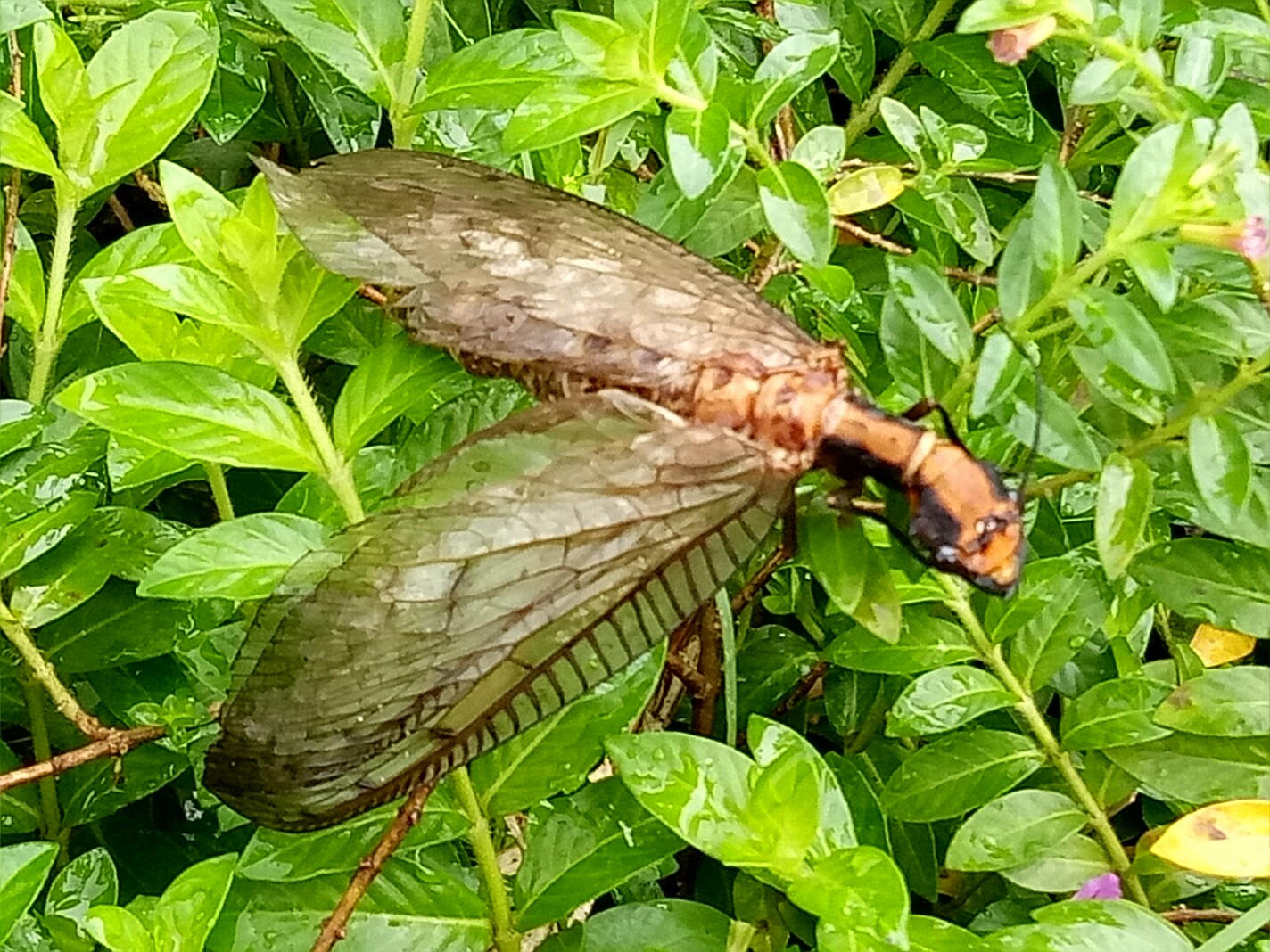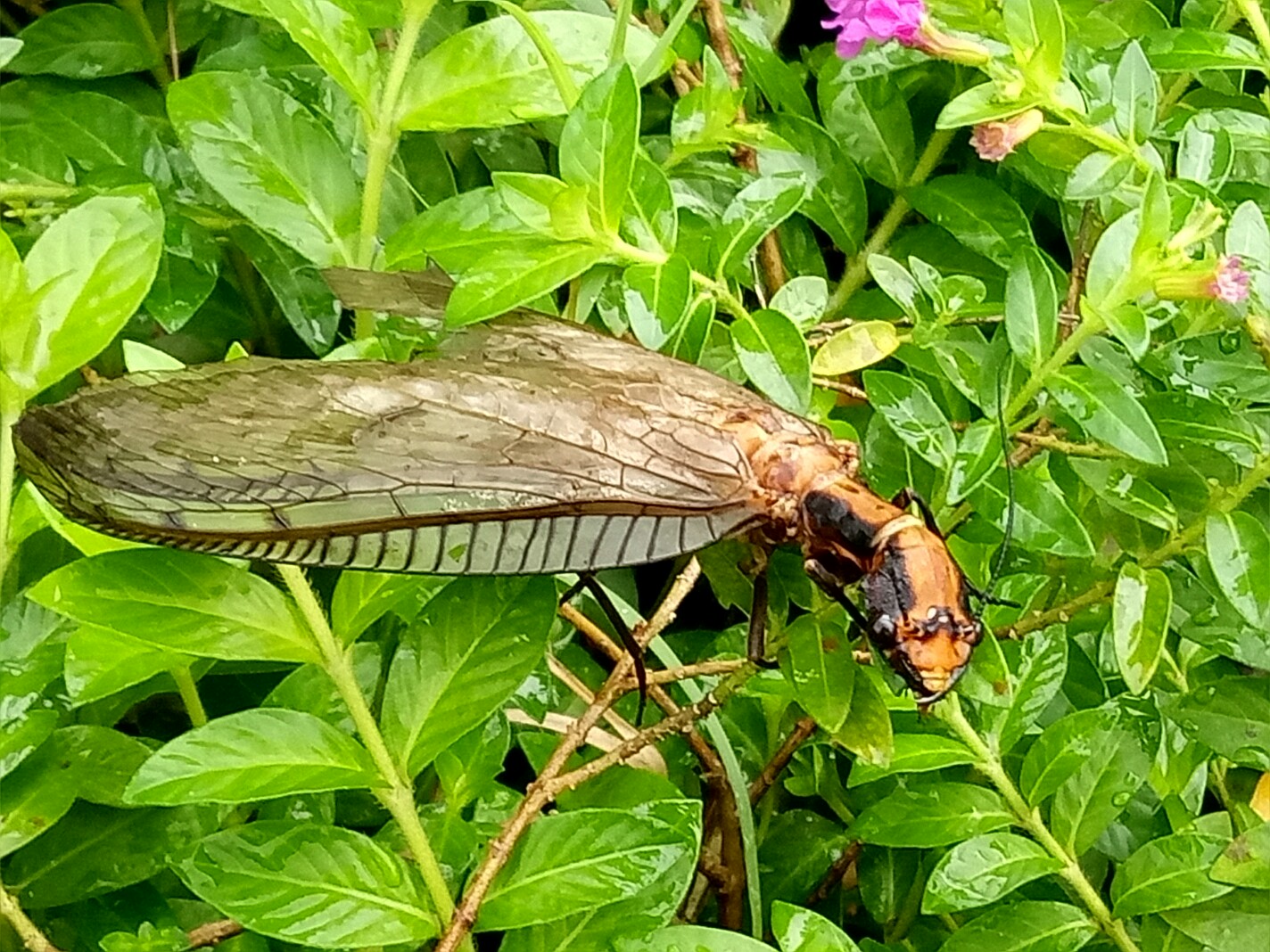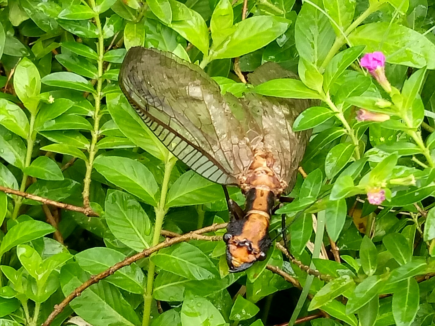 :对!是有点吓人!😄😄😄。这是今天运动路上拍的。看见它在柏油路面上被几只蚂蚁咬着翻不了身,于是用树枝把它挑上了萼距花上。后来百度后才知它的名字。成虫后上陆地只有几天的寿命。