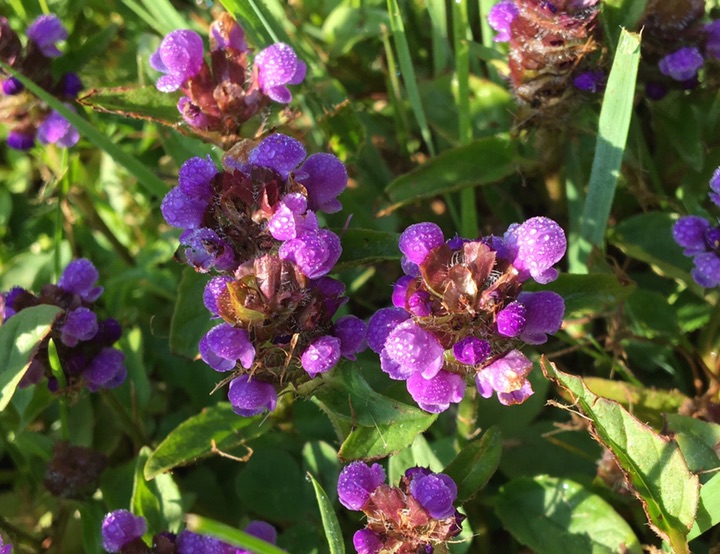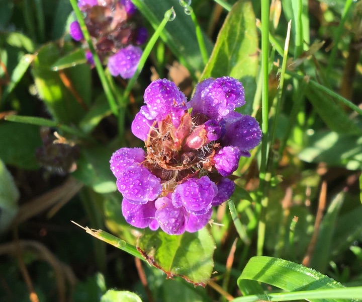 早餐前偶遇贴地而长的小紫花,贝壳帽状,上面布满了露珠,原以为是没长大的糙苏,查了以后得知是夏枯草。