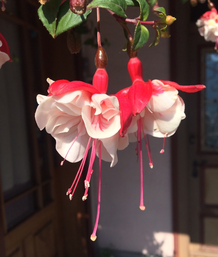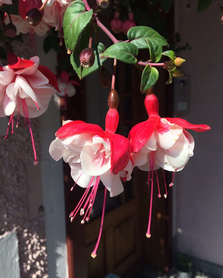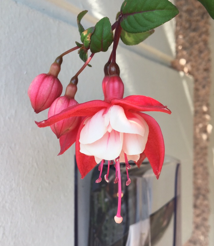 看着拍到的倒挂金钟照片,红色的外花瓣,白色的花芯,过于鲜艳,以为是假花,于是从手机中删去。