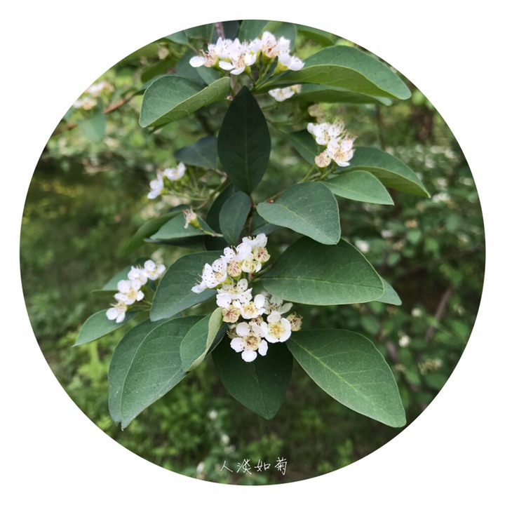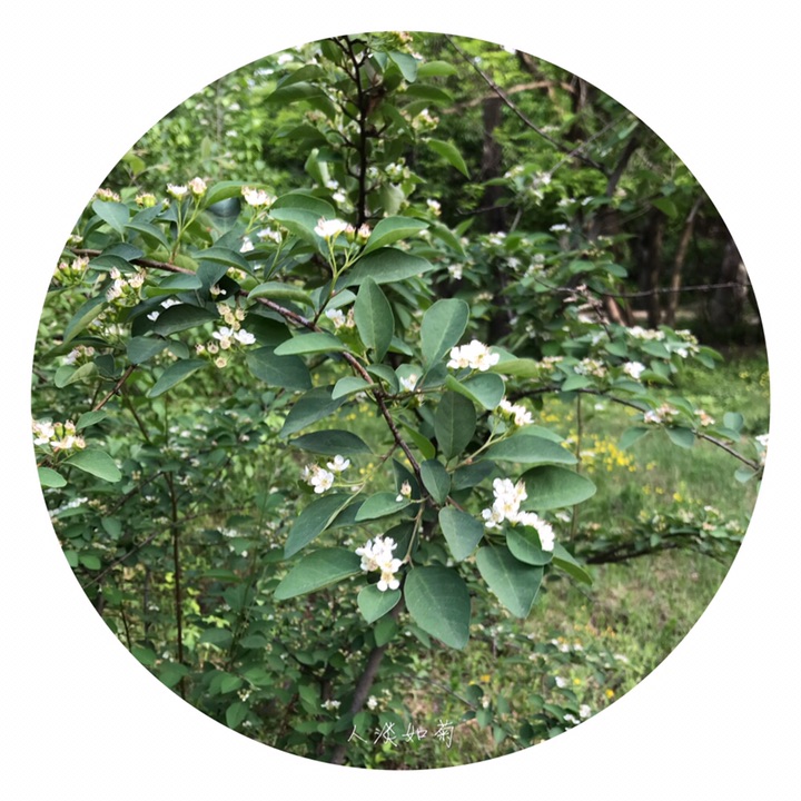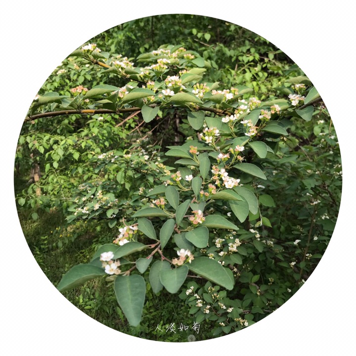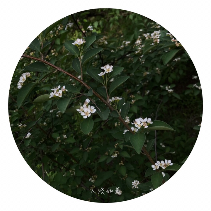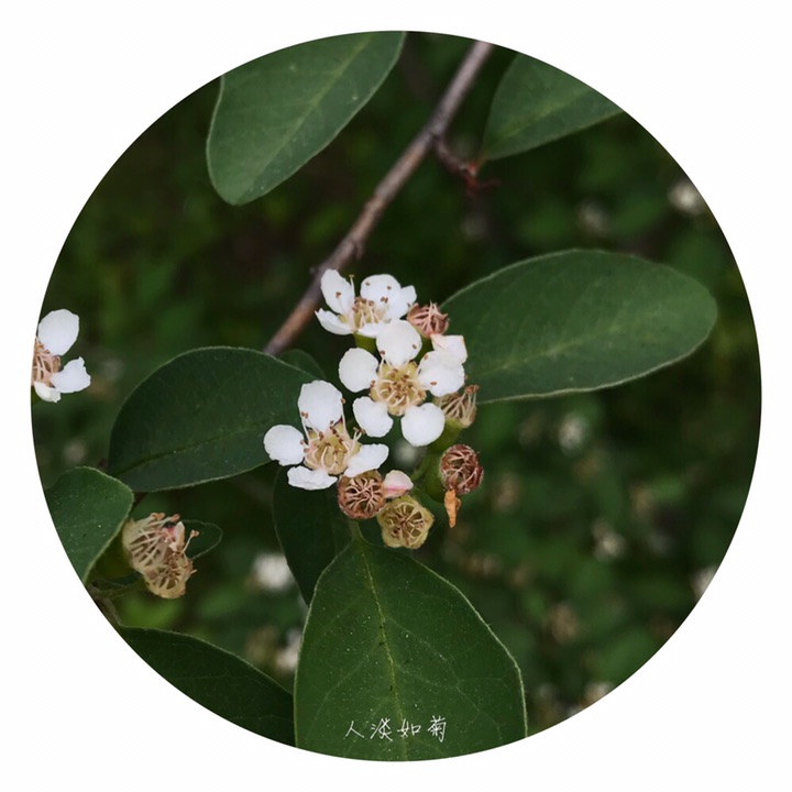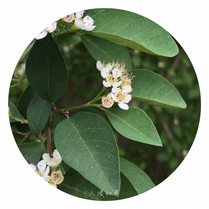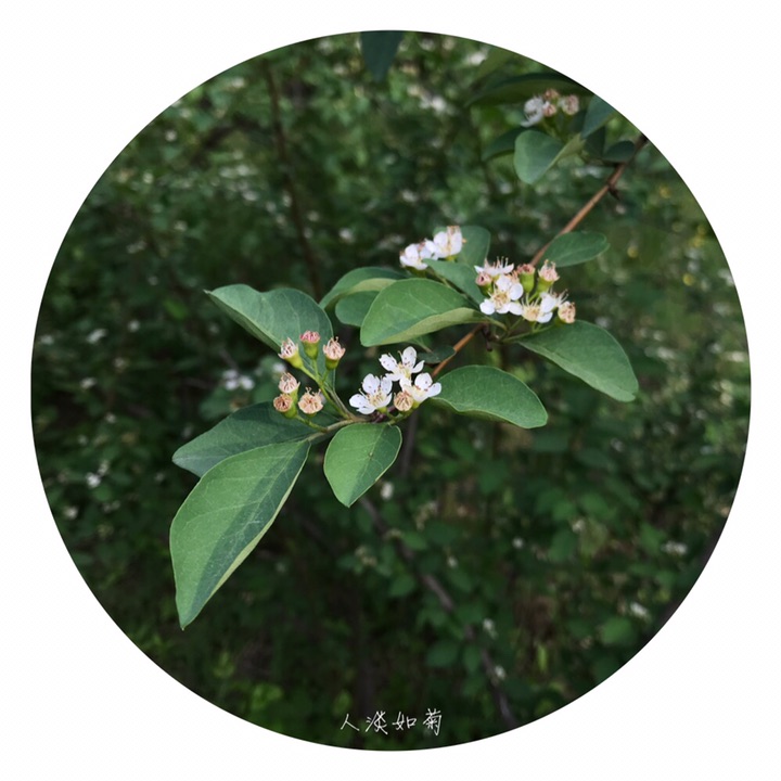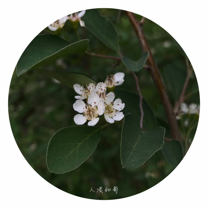 落叶灌木,高达4米;枝条细瘦,常呈弓形弯曲,小枝圆柱形,红褐色或棕褐色,无毛,幼时带紫色,具短界毛,不久脱落。叶片卵形或宽卵形,长2-4厘米,宽1.5-3厘米,先端急尖或圆钝,基部宽楔形或圆形,上面无毛,下面幼时稍有绒毛,后渐脱落;叶柄长3-8毫米,幼时有柔毛,以后脱落;托叶线形,疏生柔毛,脱落。花多数,约5-21朵,成疏松的聚伞花序,总花梗和花梗无毛,稀微具柔毛;花梗长4-6毫米;苞片线形,无毛或微具柔毛;花直径1-1.2厘米;萼筒钟状,内外两面均无毛;萼片三角形,先端急尖,通常除先端边缘外,内外两面均无毛;花瓣平展,近圆形,直径约4-5毫米,先端圆钝或微缺,基部有短爪,内面基部有白色细柔毛,白色;雄蕊约20,稍短于花瓣;花柱通常2,离生,比雄蕊短;子房先端有柔毛。果实近球形或倒卵形,直径8毫米,红色,有1个由2心皮合生而成的小核。花期5-6月,果期8-9月。