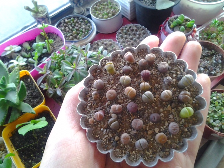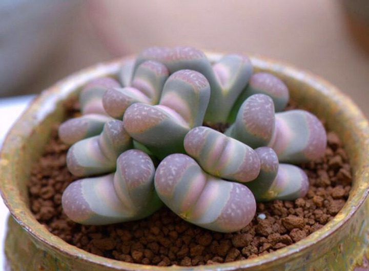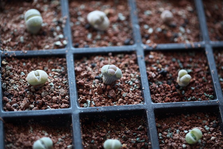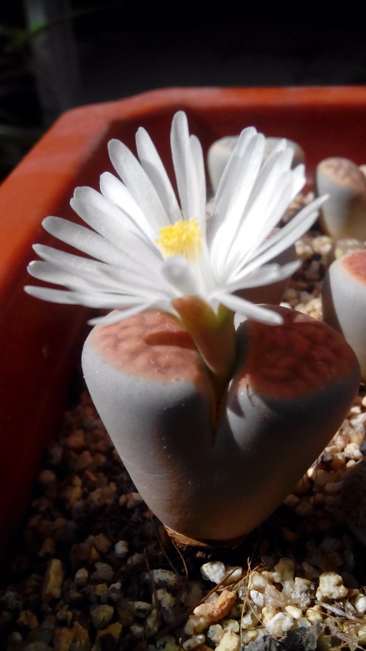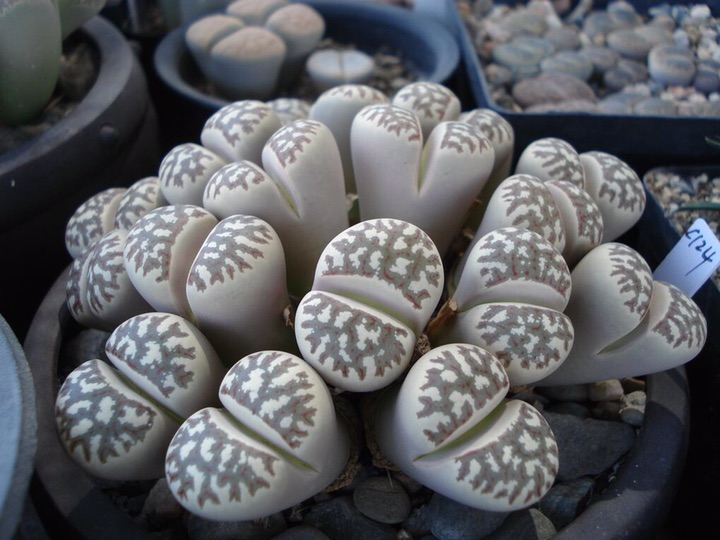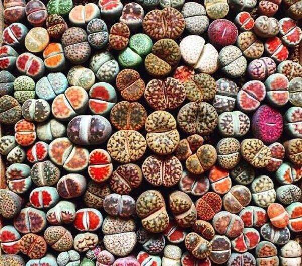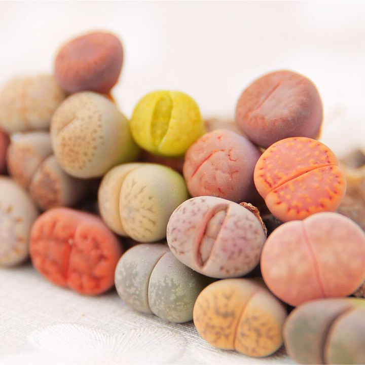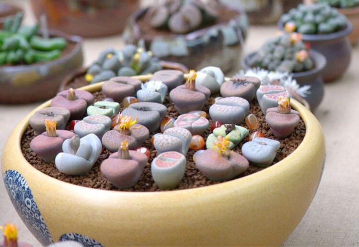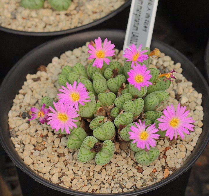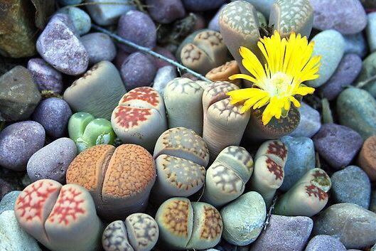 生石花为多年生小型多肉植物,茎很短,常常看不见。变态叶肉质肥厚,两片对生联结而成为倒圆锥体。品种较多,各具特色。3-4年生的生石花秋季从对生叶的中间缝隙中开出黄、白、粉等色花朵,多在下午开放,傍晚闭合,次日午后又开,单朵花可开3-7天。开花时花朵几乎将整个植株都盖住,非常娇美。并且在部分品种年限达到后会分头生群生。花谢后结出果实,可收获非常细小的种子。