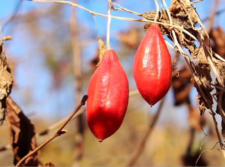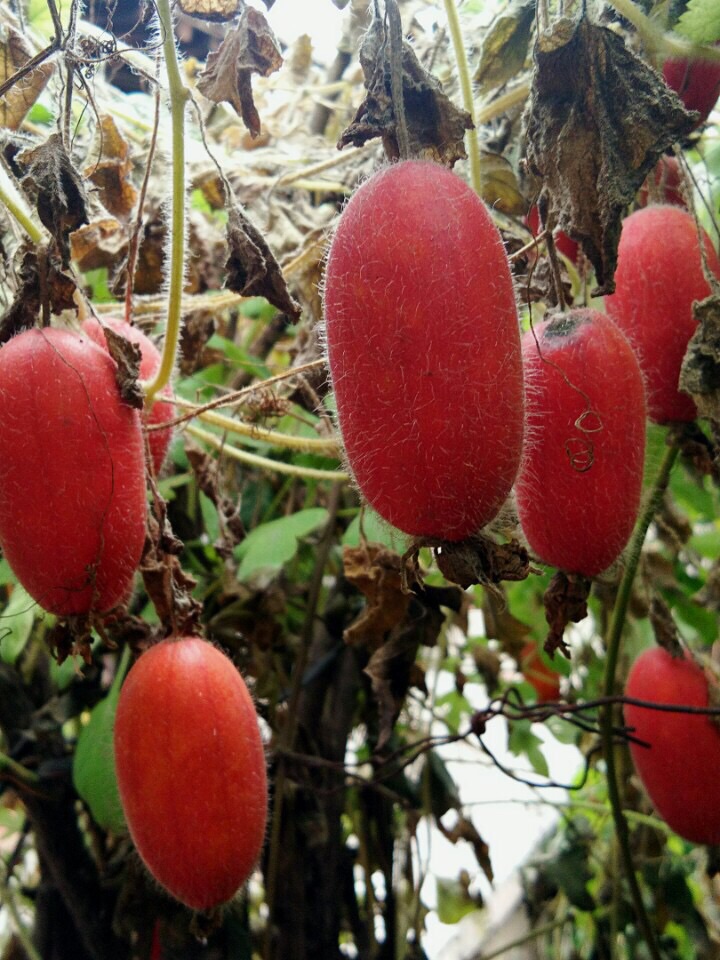 形态性状 多年生蔓性草本。茎被长毛,少分枝;卷须单一。叶互生;广卵状心脏形,长5~10厘米,宽4~9厘米,先端尖,边缘微锯齿缘;两面均被毛茸;有叶柄。花腋生,单一,雌雄异株;雄花的花梗短而细,雌花的花梗长而粗;萼短钟形,裂片5,线状披针形,反折;花冠黄色,钟形,5深裂,花瓣狭卵形,被短毛,长2.5厘米左右;雄花的雄蕊5枚,不育雄蕊线形,花丝有毛;雌花有短的退化雄蕊,子子房下位,长圆形,被长柔毛,具3叉状肾形柱头。瓠果长卵形或广椭圆形,长4~5厘米,宽2.5厘米,红色或绿色。花期7~8月。果期8~9月。